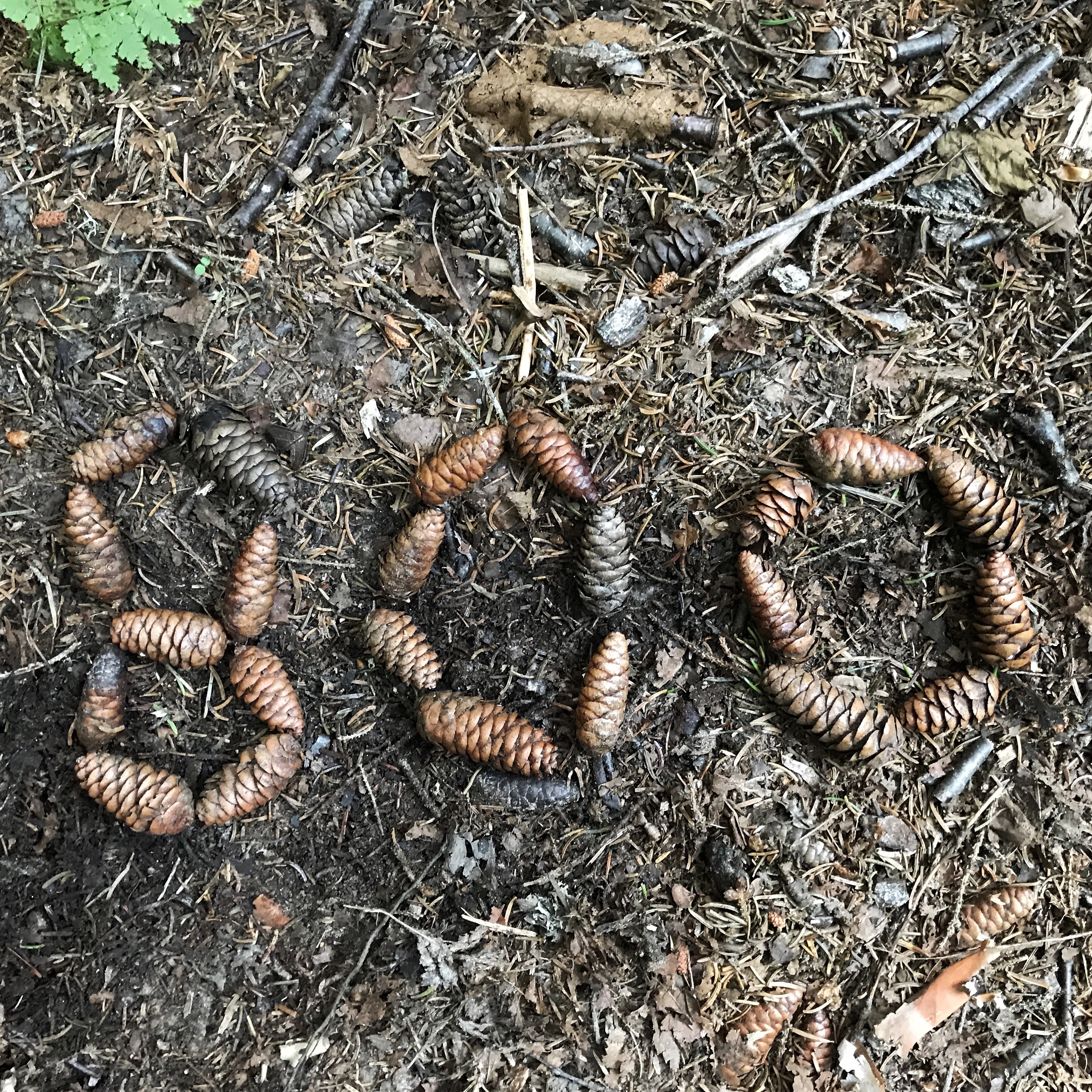 I felt grateful to have good company for such a long day. Walden and I talked on and off as we walked into the evening. She has a dry sense of humor that resulted in much laughing while I cursed the bogs and the boulders and diminishing daylight. During one of my obsessive mileage checks, I realized that I had crossed my 800 mile mark. I rushed through making a mediocre sign with bits of nearby fern. I felt unsatisfied with it but too exhausted to make it better. I got back in front for the short climb ahead of us. As we walked, I noticed an abundance of tiny pine cones that seemed like much better material for my mile marker, so I stopped and redid it even though I felt ridiculous.