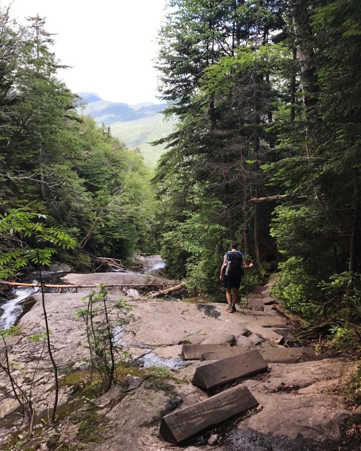 Around 11, I felt like it would be wise to get moving, so I made the first moves to leave the summit. Floater immediately pulled ahead and when we got to tree line she was out of sight. I ended up leap frogging with Walden for a bit until our paces lined up and we spent the rest of the day together. The descent started out mildly enough, which is to say it involved steep rocks that could be navigated with relative ease. The trail eventually got steeper and the steps larger. My knees started to protest and the distance left to cover felt endless. Walden and I agreed that lunch at the shelter was required to be able to make it all the way down the mountain. Here’s the view from the shelter: