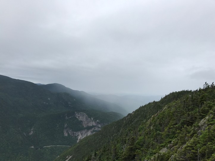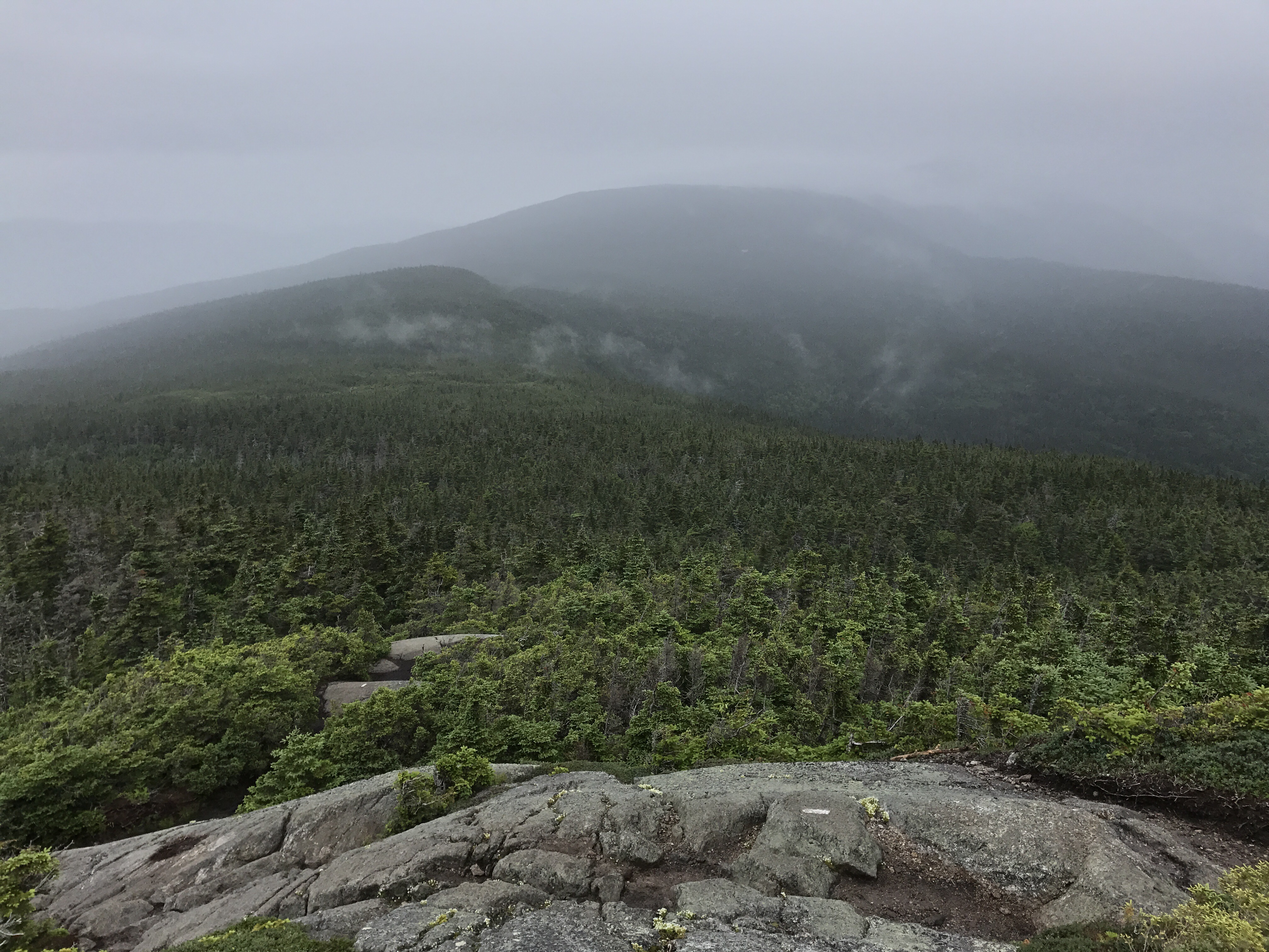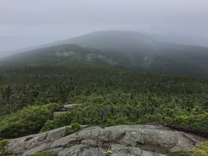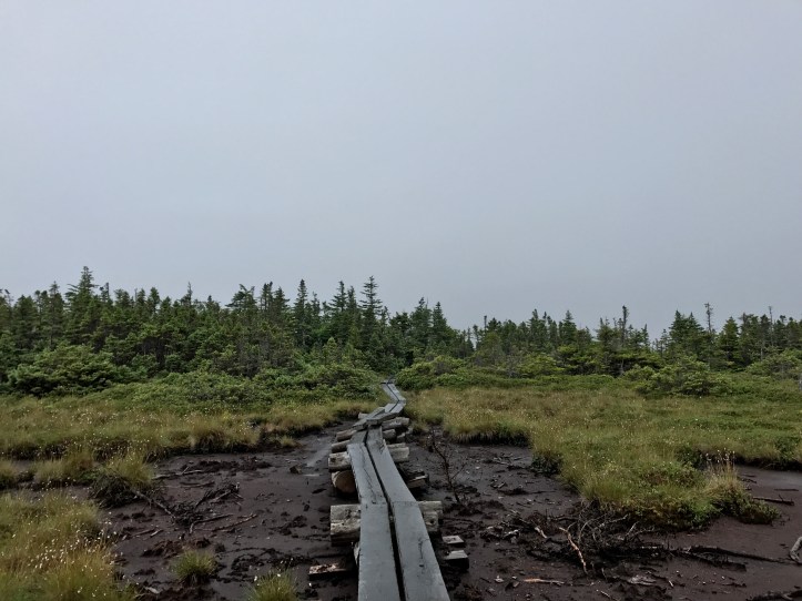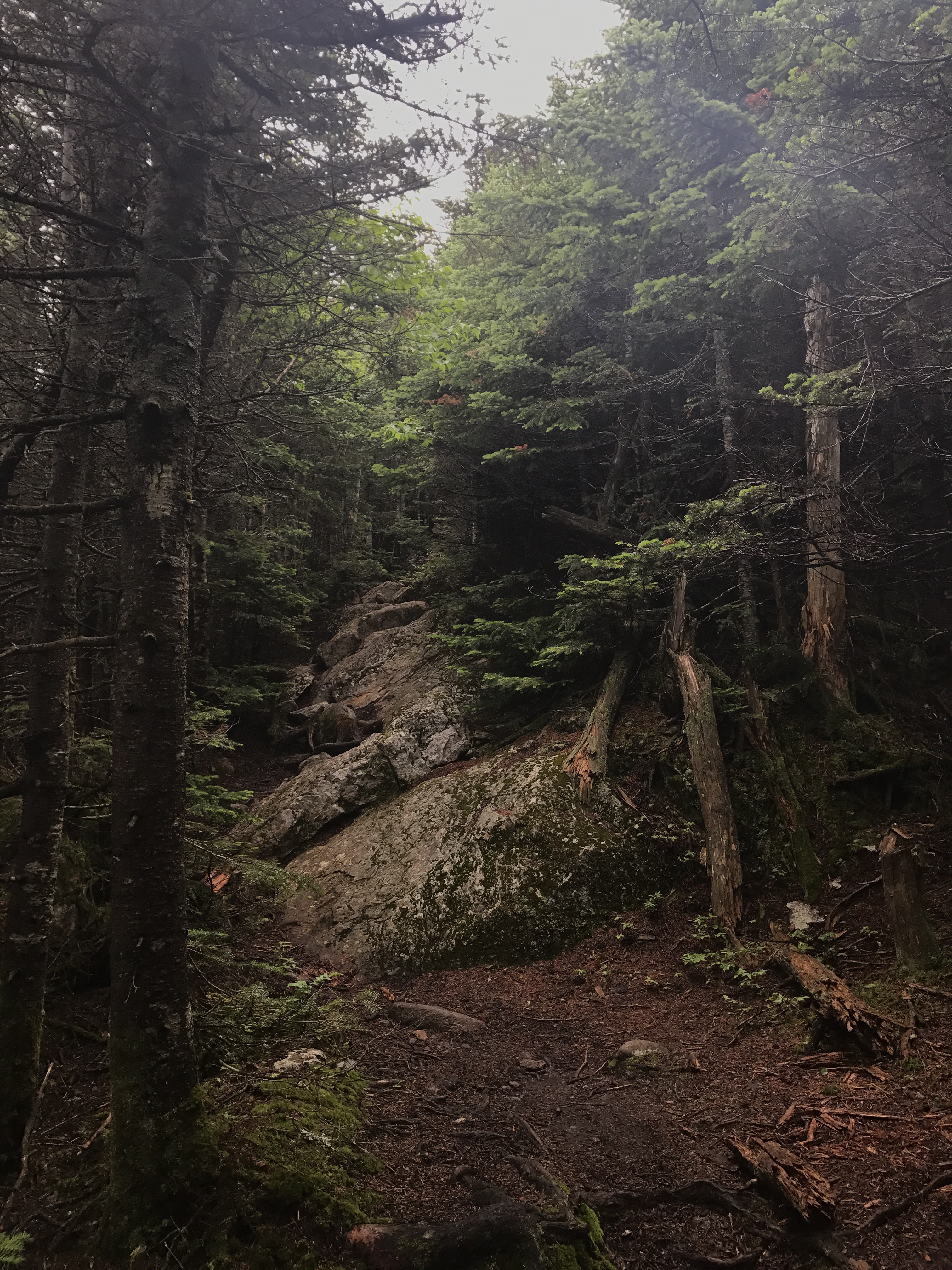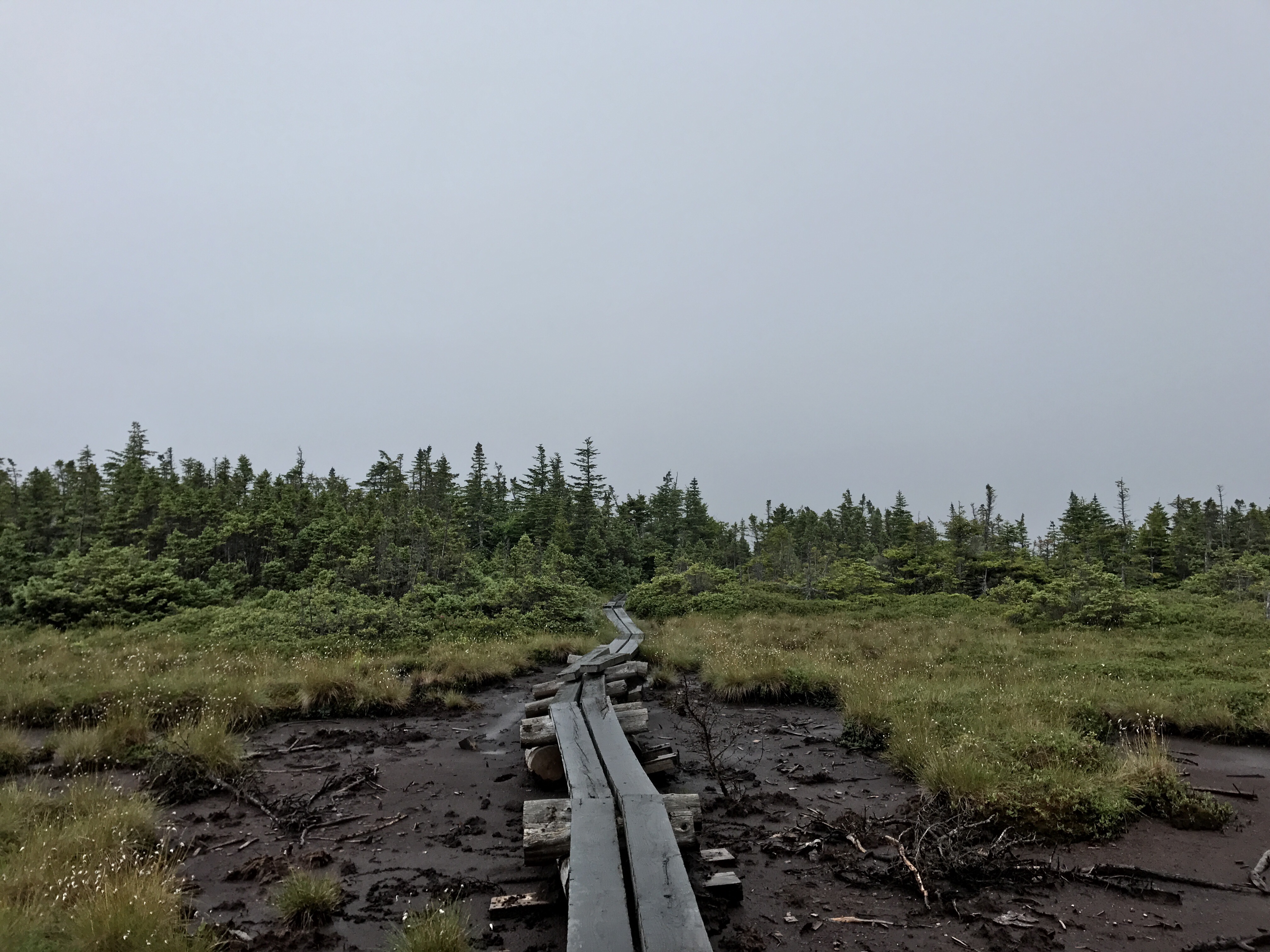 It started to spit right as I began the descent from Jackson across flat, exposed rocks that glistened with moisture. I sat and scooched in several places for fear of falling the way I had yesterday with little in the way to keep me from tumbling down the side of the boulders. There were a few short, steep sections and then the trail flattened out to a bog area with boards and exposed rock that almost felt like walking on a sidewalk.
