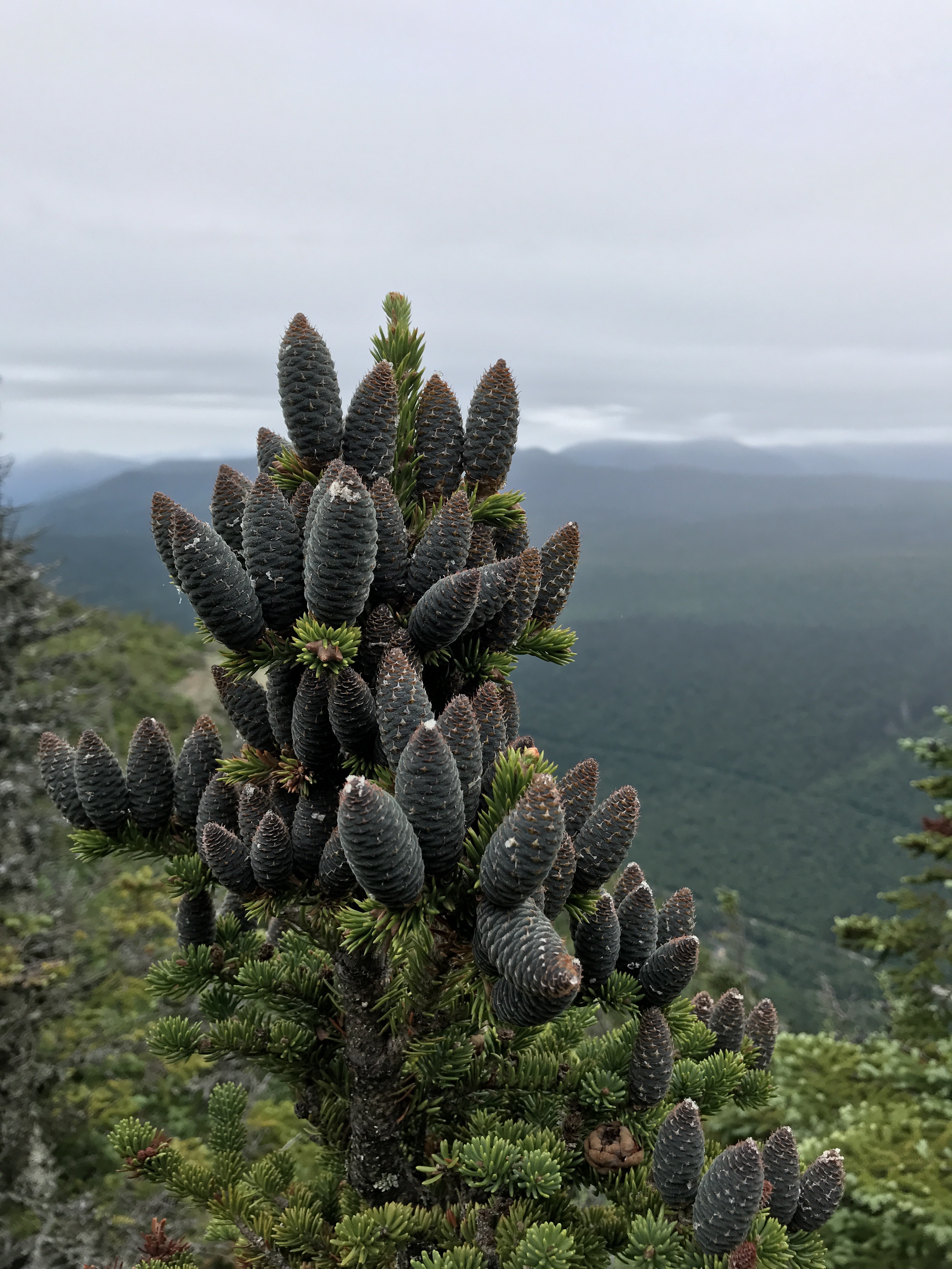 I ran into fstop and Leif on my way up, but I didn’t stick around to talk because I felt like being alone. I also ran into a SOBO whose name I can’t recall. He warned me about the difficulty of Webster. I tried to comfort myself by reminding myself that everyone has different kryptonite. What kicked his ass might not register on my oh shit radar. After a thigh burning series of climbs, I finally came to one of several views from increasingly higher cliffs on Mt Webster. Here are a few pictures from the climb along with little blueish green fir cones that I’m obsessed with.