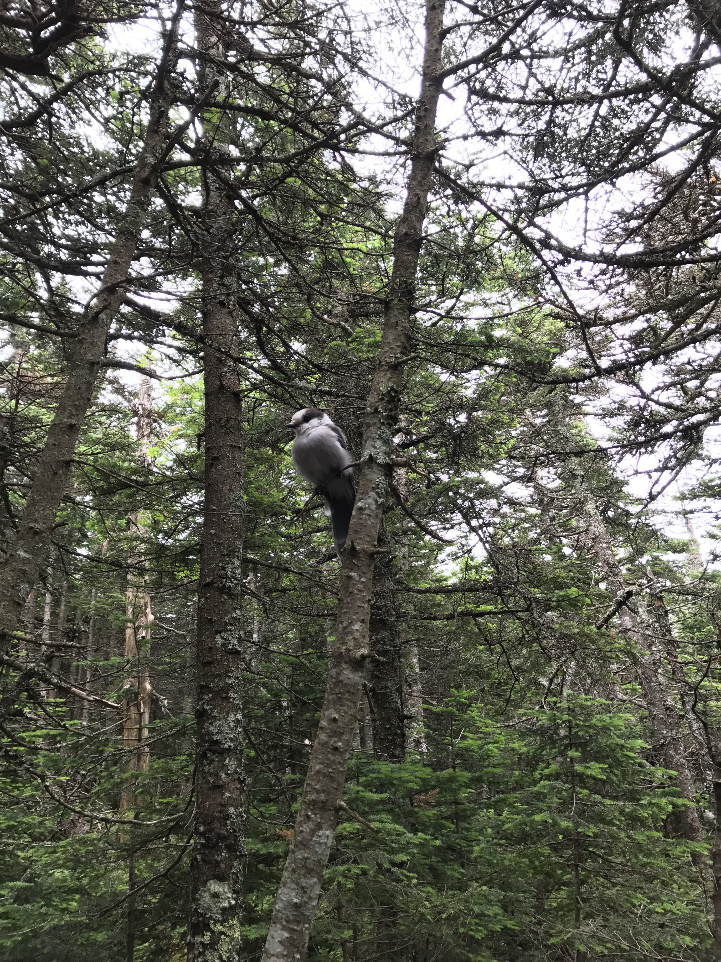 I also heard a strange bird noise that sounded something like the coo of a parrot. I stopped to listen and noticed a flash of movement a few trees away from me. The bird creating the sound turned out to be a large, plush, gray and white creature that was very interested in me. It hopped progressively closer and stared at me while I stared back. I later found out I had been watching a gray jay, which are notorious for eating food from hikers hands.