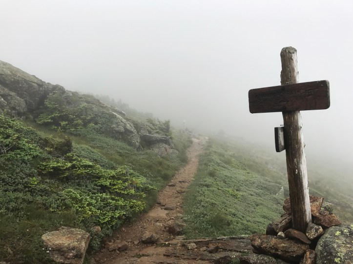 Then I hauled ass, basically jogging the flats and catapulting up the rocky climbs. I did have to slow down for the short stints of descent every now and then. The total white out around me made me feel less guilty about rushing (see top picture). I stopped to take a few flower pictures, but worried that the NOBO would catch me. Then I passed through another bog that transitioned to an exposed trail above treeline. I somehow managed to catch up with waves, which surprised us both. He said oh! And then turned and kept hiking. About 20 minutes later, it started pouring. I almost immediately gave up on avoiding puddles and sloshed through ankle deep water, which made my shoes somewhat cleaner and actually felt kind of good on my feet. It was windy and foggy, and I could barely see waves a hundred yards ahead of me. There were several trail junctions to navigate. I can see how people get lost.