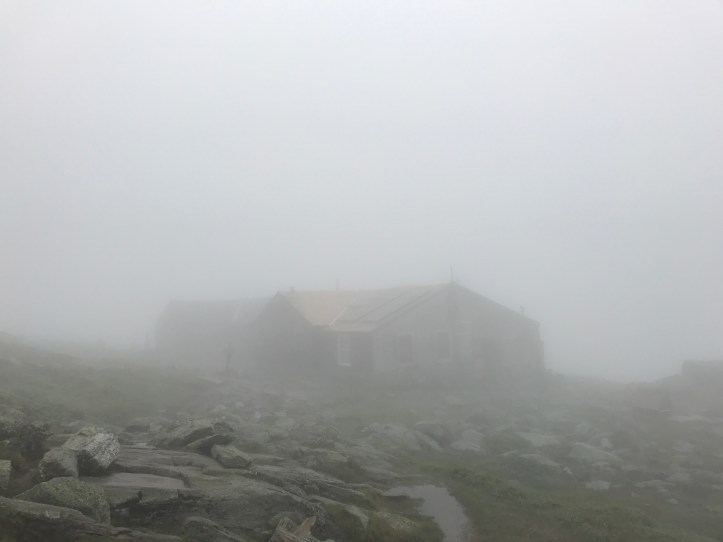 Lakes of the clouds hut looked abandoned as I approached, but I opened the door to a bustling room full of people sitting at the long dining hall tables. I stood dripping in the entryway and asked about work for stay. A cheerful hut master approved immediately and showed me to the hall where thru hikers can loiter. I put my soaked pack down and was immediately approached by a lodge guest from CT who enjoys talking to thru hikers. He introduced me to his friend, Inga, who then began talking to waves as well. I decided to embrace their friendliness and ask whether they had qtips because I was running low on wound cleaning supplies. Inga came back with a giant first aid kit (she’s in the healthcare field) and rooted around for antiseptics. A few energetic SOBOs arrived for work for stay. I finally had to excuse myself from the conversation with the man from CT, so I could change out of my wet clothes. I changed into my zpacks wool socks (I love you, wool socks) and my neon pink long johns with my sleeping shorts over top to cover the growing holes in the rear of my pants. No need to scare the guests. Then I hung my wet clothes on the boards they use to pack things in/out of the hut. I sat on the bench in the pass thru areabetween the dining room and the bathrooms and tried very hard not to eat all the snacks in my food bag. Waves and I played a game of go fish with the SOBOs while the kitchen croo jammed out to music as they prepared dinner.