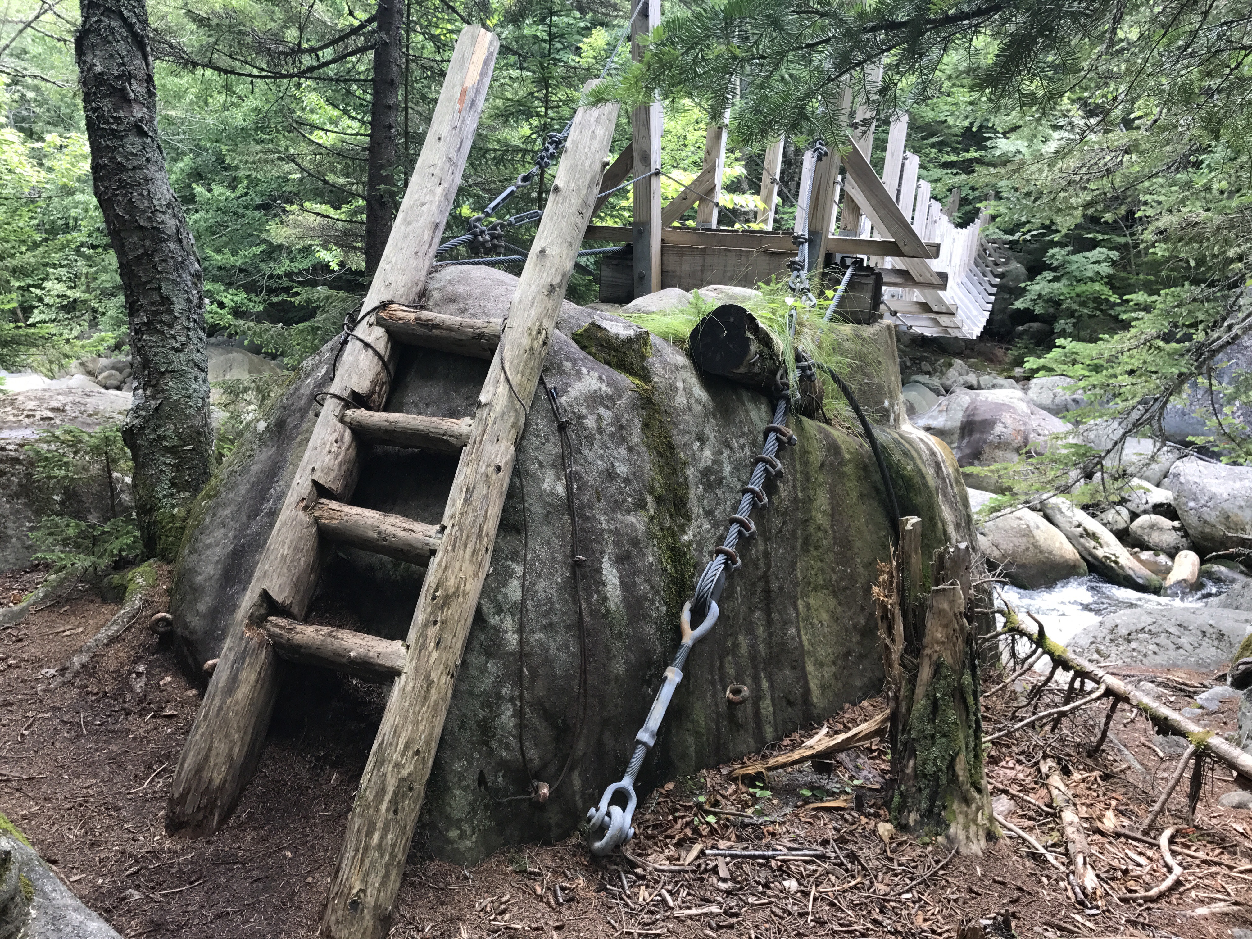 The trail went through a bunch of intersections. I ran into cosmo and his daughter near this suspension bridge. They’re hiking south towards Washington. I warned them of all the rocks and the slow going. I wonder if they made it all the way to lakes of the clouds. When I saw them they were hours out, and it was already 130. The trail transitioned to a wetter zone with stream crossing after stream crossing. This meant roots and rocks and a lot of little dips in elevation, all of which slowed me down even more. I started to settle on the idea of getting to a stealth camping spot near one of the wildcat ledges. It’s not ideal because it’s uncertain, but it gets me a few more miles, and there’s not really anywhere else to stay around Pinkham notch.