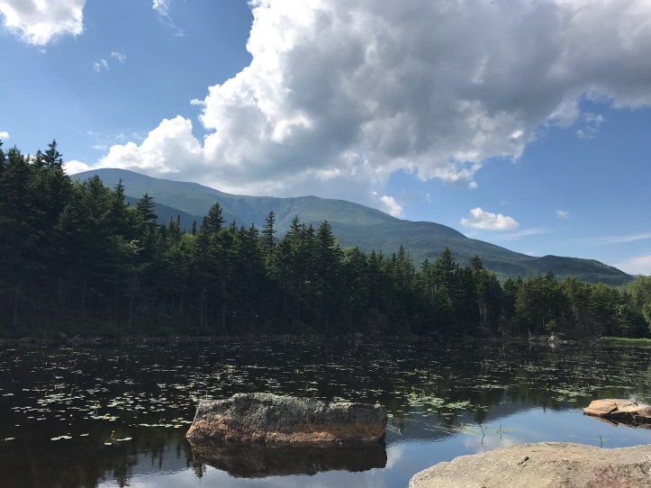 Then I left the strange, shiny visitor center and crossed the busy road. A guy on a bike took a spill from a standstill because he couldn’t get his foot unclipped. He hopped up and jokingly blamed the fall on me, which I didn’t find too funny, but I let it go. He mentioned wanting to see the northern lights, which piqued my interest since my campsite will be somewhat high in elevation. Then I walked across the highway and nearly pushed over a teenager who wouldn’t give way on some bog boards. He tried to pass me and there’s just not enough room for two people. My right foot ended up in the mud, but thankfully it didn’t get wet. I was cranky for a bit after that, but the trail required enough concentration to occupy my mind. Even circling the edge of a pond can be tricky in NH. Here’s lost pond, which was hard to navigate in terms of roots and boulders:
