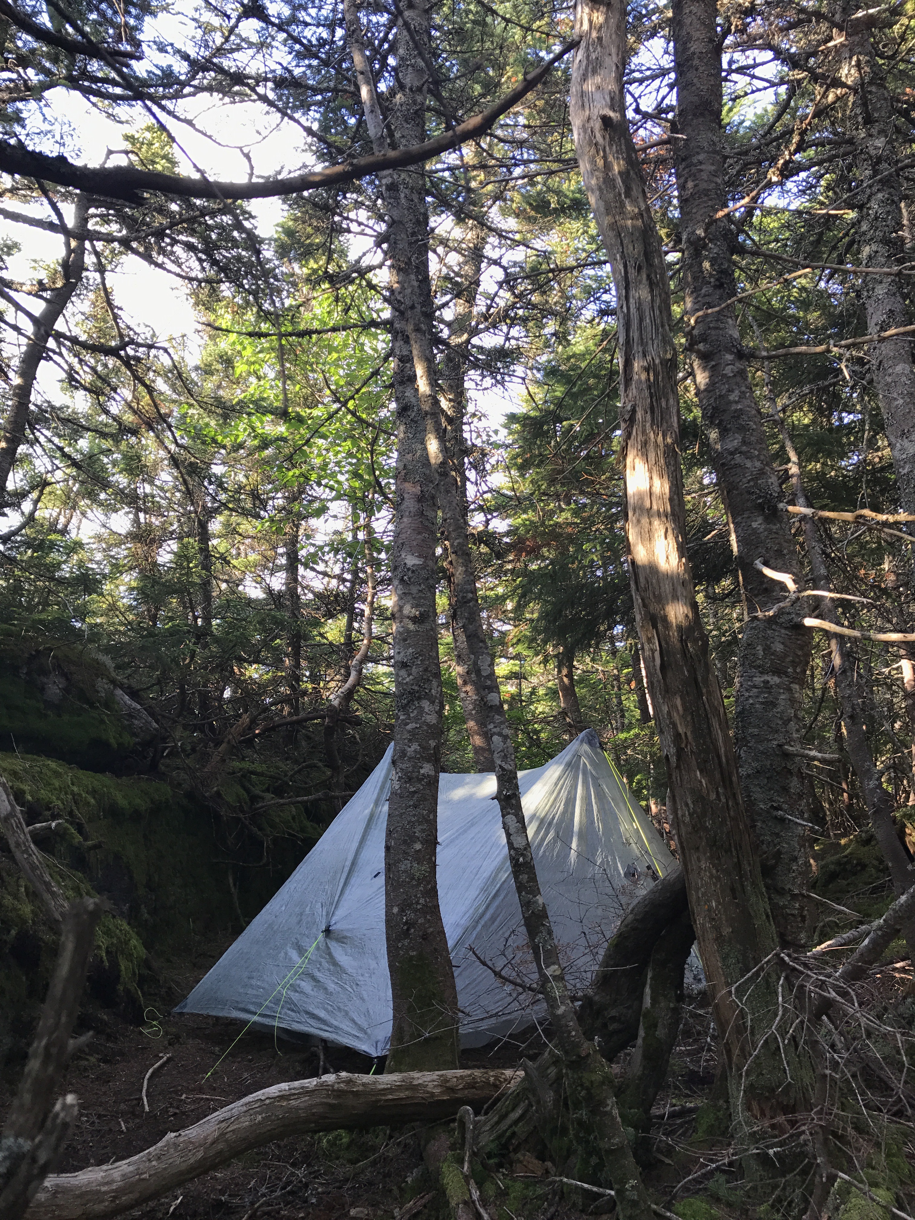 Then came another stretch of steps and yet another crazy set of boulders, which led me to the ledge where the stealth site should be. The ledge looks westward with quite a view of mount Washington and the surrounding mountains. Sunset! And a phone signal! Jackpot. The tent site was just off the trail to the left after a short climb down from the ledge. I dropped my pack and wandered around looking for where in the world to hang my food amongst the tightly packed fir trees. I settled on a leaning tree trunk that was about the right height and had a slight patch of open area around it. Not perfect, but better than dealing with throwing a line along the teeny tiny limbs. I set up my line and then pitched my tent in the lumpy, small spot.