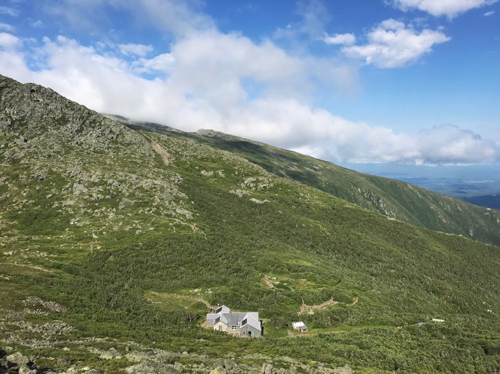 Here’s the hut from about halfway up Madison. I ran into a few hut guests who had hiked up to the summit and were headed back to the hut. I’d spoken to one of them in the bathroom, and she gave me a warm greeting. She asked if I needed anything, which was thoughtful. I asked her how much longer she her trip would be. She lamented her return to FL tonight, and I replied “but it’s so flat!” to which she laughed and agreed.