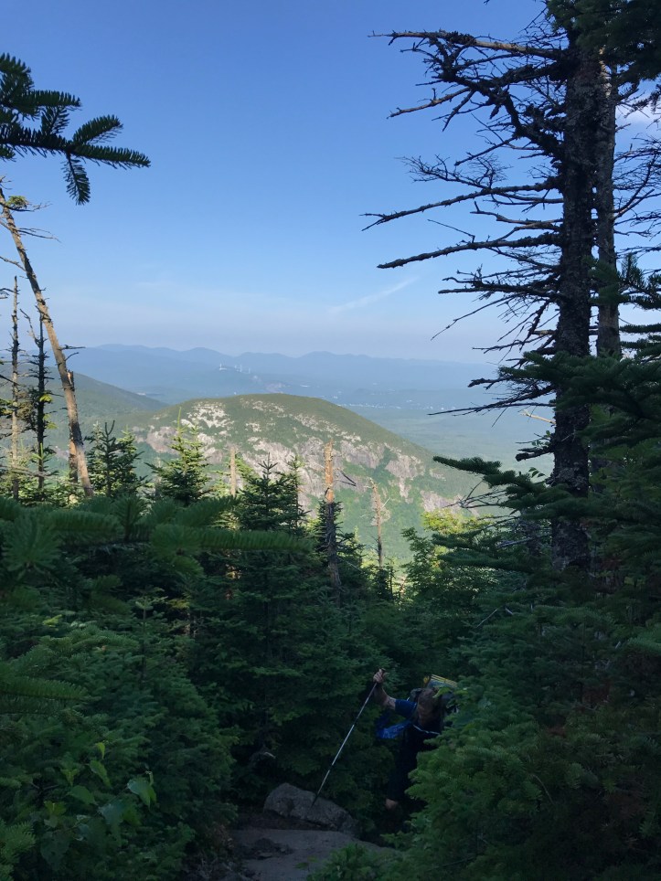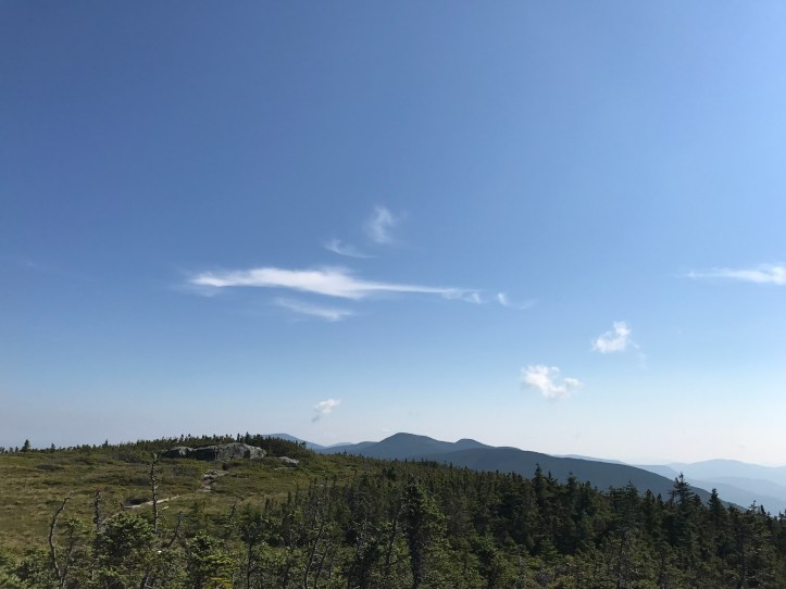 I was packed up and walking towards the trail around 645. Took a quick duck down to the pond to see if the moose had returned, but no dice. The morning started with a steep climb that had me drenched in a matter of minutes. I came to a small stream about a mile after the shelter. The water stops are few and far between today, so I gave in and filtered an extra liter. As I stooped over my water bottle squeezing my sawyer bag, the rest of the crew from the shelter trickled in. Everyone stopped to fill up and collectively whined about the water situation. I left them griping and made my way up the next steep climb towards the summit of Mount Success. It seemed as if it would be a mile of boulder scrambling, but it flattened out to periodic bog boards and mildly rocky footing before the final boulder scramble to get to the summit. The trail was set a bit lower than the trees with an abundance of moss that reminded me of the whites and the higher peaks of MA and VT.