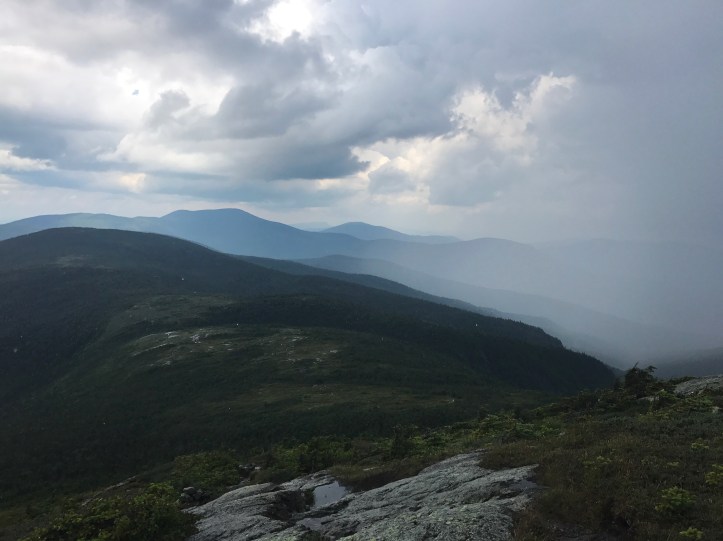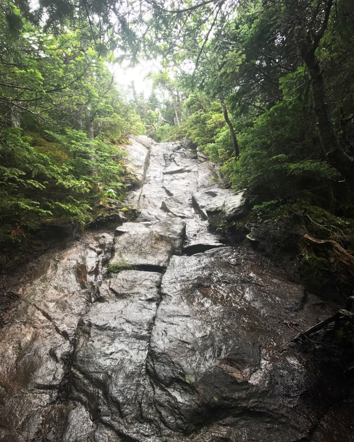 I wound my way down east goose eye, taking care not to slip on the wooden boards in place to theoretically make the descent easier. The rain slowed to a light drizzle, but the trail spit me out onto the bald just as the thunder intensified. The lack of lightning made me feel slightly less insane for crossing the bald in the storm. I made my way across the exposed section, dipping back into the trees only to be taken back out into the open repeatedly. Then came the climb up goose eye North, which also left me more exposed than I wanted as the rain picked up and the thunderstorm settled directly overhead. The descent from goose eye north was one slick boulder face after another. I wanted to sit down and give up a dozen times. I also considered the possibility of just skipping Maine altogether. I felt mentally exhausted from the constant fear of slipping down the side of rock faces like this: