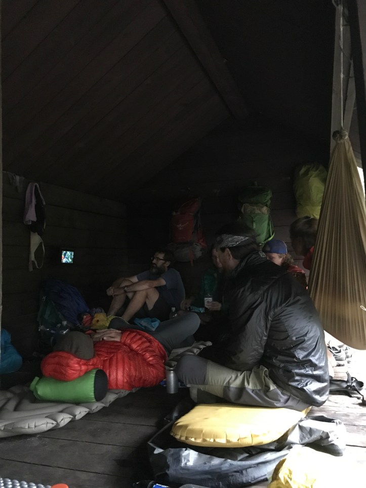 Eventually, the terrain eased up to a normal version of hard with actual rocks instead of sheets of boulders. I reached the full goose shelter around 330 and found the entire NOBO crew from last night. They had their gear spread out and someone was sweeping the shelter floor. I had hoped to see other hikers so I could navigate the decision of whether to stay or go. I had assumed they would all continue through the notch, so I was surprised to find they had stopped short. Hawaii said they’d been there for about a half hour and had just made the decision to stay. I sat on the edge of the shelter and weighed my options. I really wanted to get the notch out of the way because it’s plaguing me in much the same way moosilauke did. However, the prospect of going through it alone on a day when the boulders were likely wet and it was potentially going to rain again seemed unwise. I ate a snack and continued to dither. The idea of getting stuck in the rain alone is finally what did me in. I stood up and reached down to unhook my gaiters. Hawaii exclaimed “you calling it??” I sheepishly said yes and continued taking off my shoes. Then I set up my bed and switched into dry shorts. I added a few things to the collection of soggy clothes hanging from the trees and proceeded to loaf about for the next two hours. It poured about 90 minutes after I made the decision to stay.