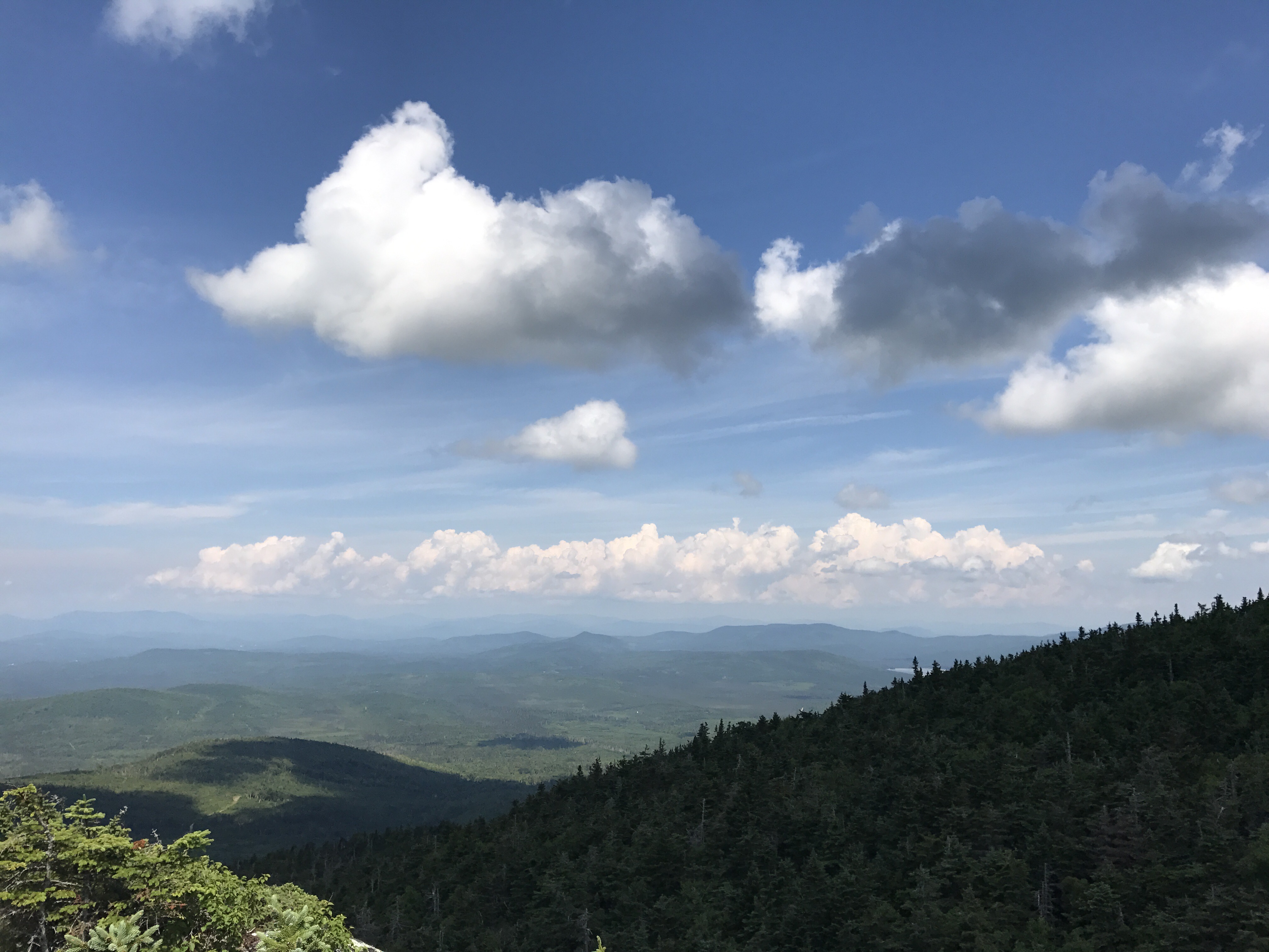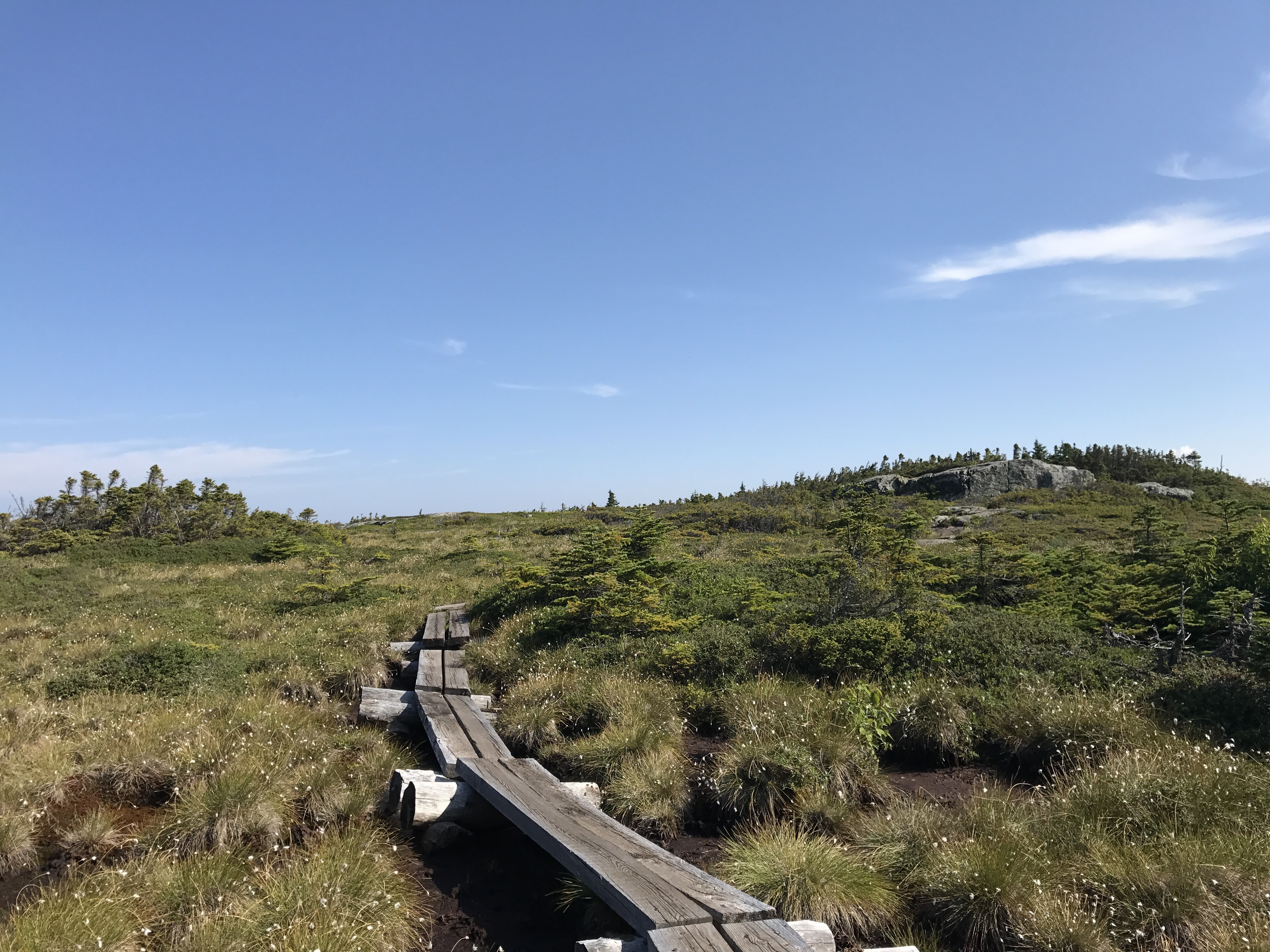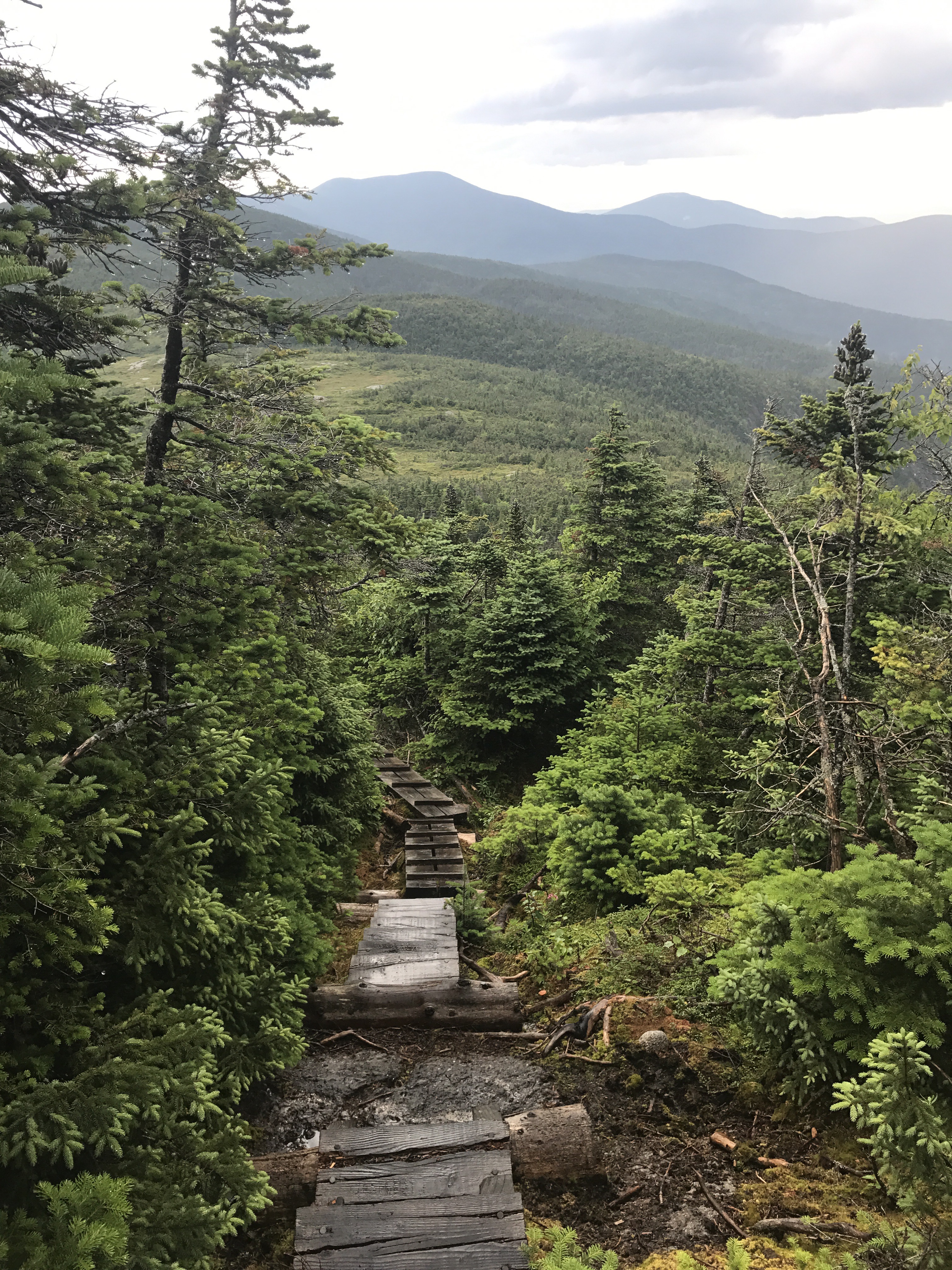 I was packed up and walking towards the trail around 645. Took a quick duck down to the pond to see if the moose had returned, but no dice. The morning started with a steep climb that had me drenched in a matter of minutes. I came to a small stream about a mile after the shelter. The water stops are few and far between today, so I gave in and filtered an extra liter. As I stooped over my water bottle squeezing my sawyer bag, the rest of the crew from the shelter trickled in. Everyone stopped to fill up and collectively whined about the water situation. I left them griping and made my way up the next steep climb towards the summit of Mount Success. It seemed as if it would be a mile of boulder scrambling, but it flattened out to periodic bog boards and mildly rocky footing before the final boulder scramble to get to the summit. The trail was set a bit lower than the trees with an abundance of moss that reminded me of the whites and the higher peaks of MA and VT.