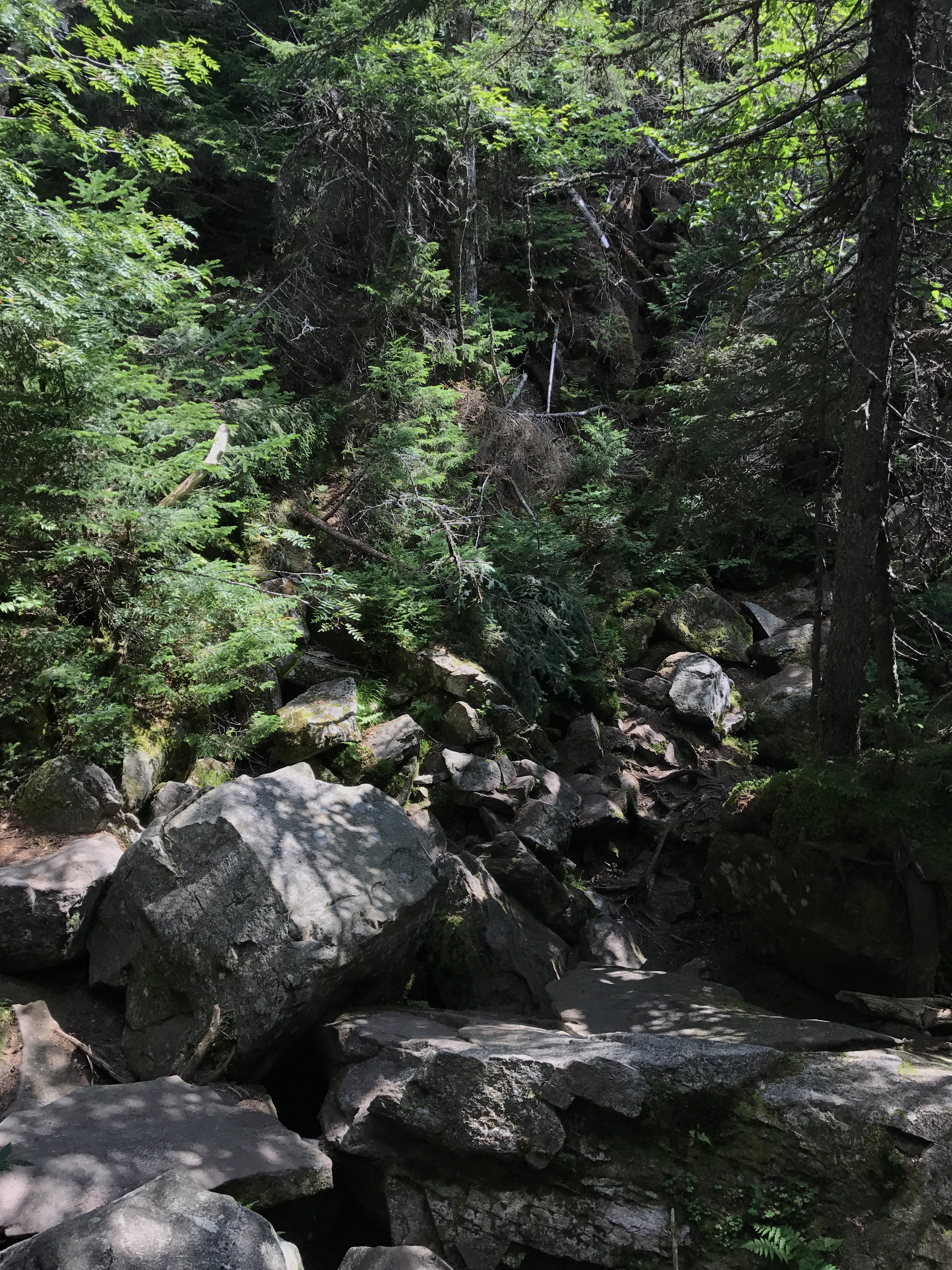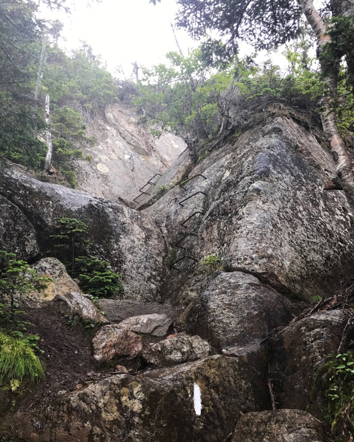 I wound my way down east goose eye, taking care not to slip on the wooden boards in place to theoretically make the descent easier. The rain slowed to a light drizzle, but the trail spit me out onto the bald just as the thunder intensified. The lack of lightning made me feel slightly less insane for crossing the bald in the storm. I made my way across the exposed section, dipping back into the trees only to be taken back out into the open repeatedly. Then came the climb up goose eye North, which also left me more exposed than I wanted as the rain picked up and the thunderstorm settled directly overhead. The descent from goose eye north was one slick boulder face after another. I wanted to sit down and give up a dozen times. I also considered the possibility of just skipping Maine altogether. I felt mentally exhausted from the constant fear of slipping down the side of rock faces like this: