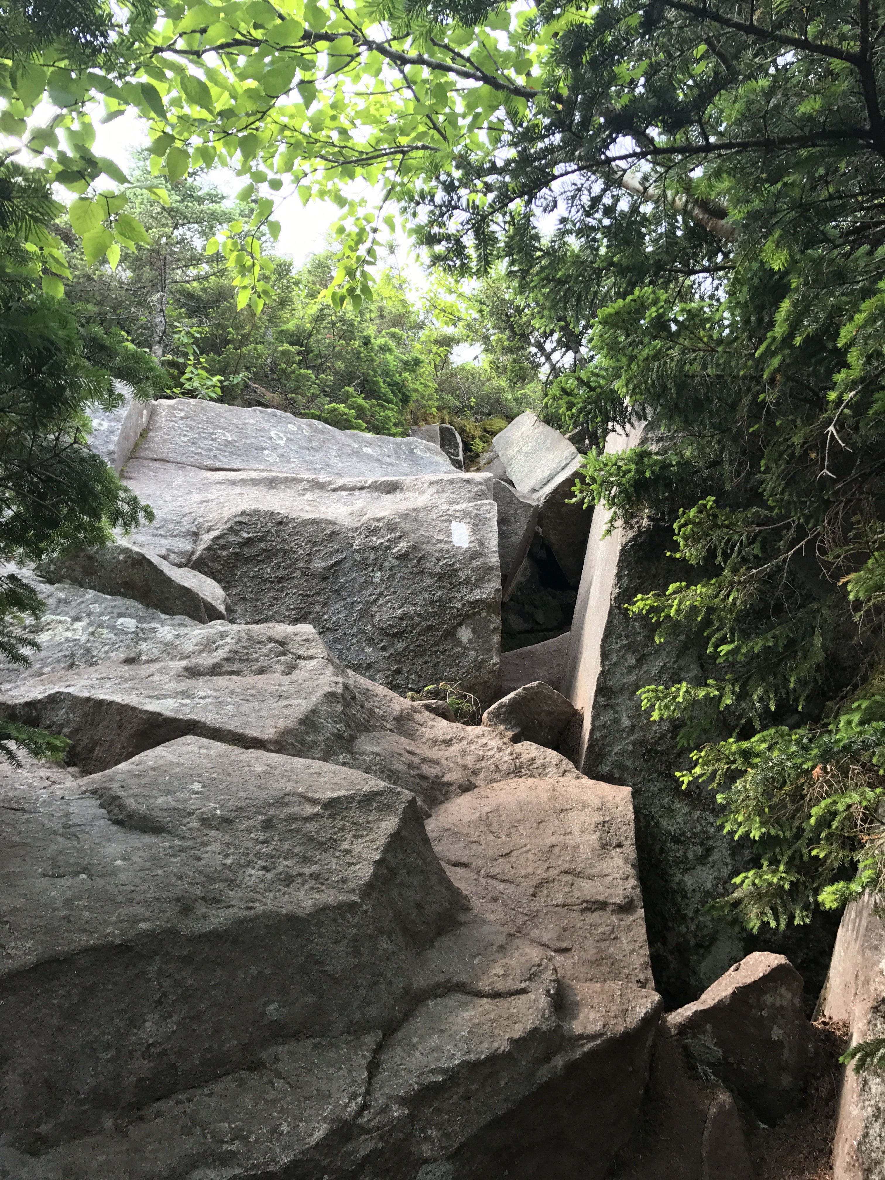 I ran into the cluster of NOBOs again at the Maine border where they asked me to take their boomerang dance video to commemorate crossing into their last state. I lingered after their departure and ate a snack to the sound of dragonflies popping around me. The trail was reasonable for a about five minutes until I popped out to this view that was followed by descending the giant boulders in the second picture.