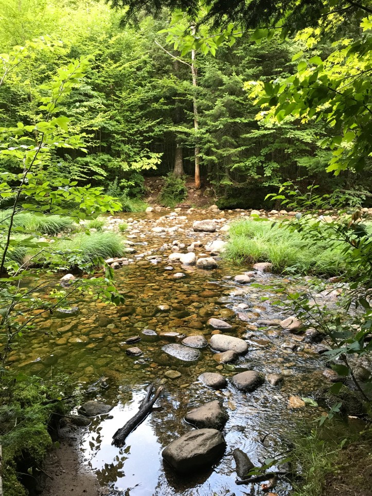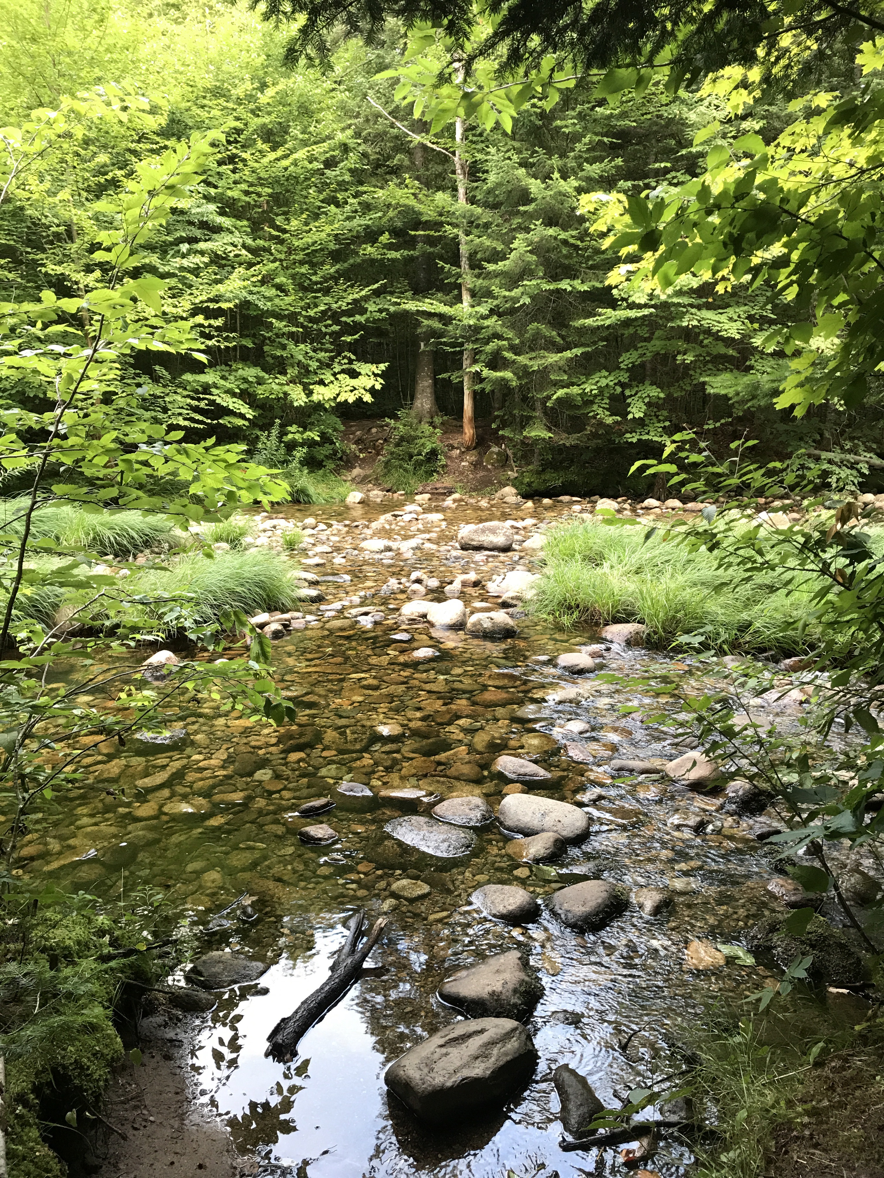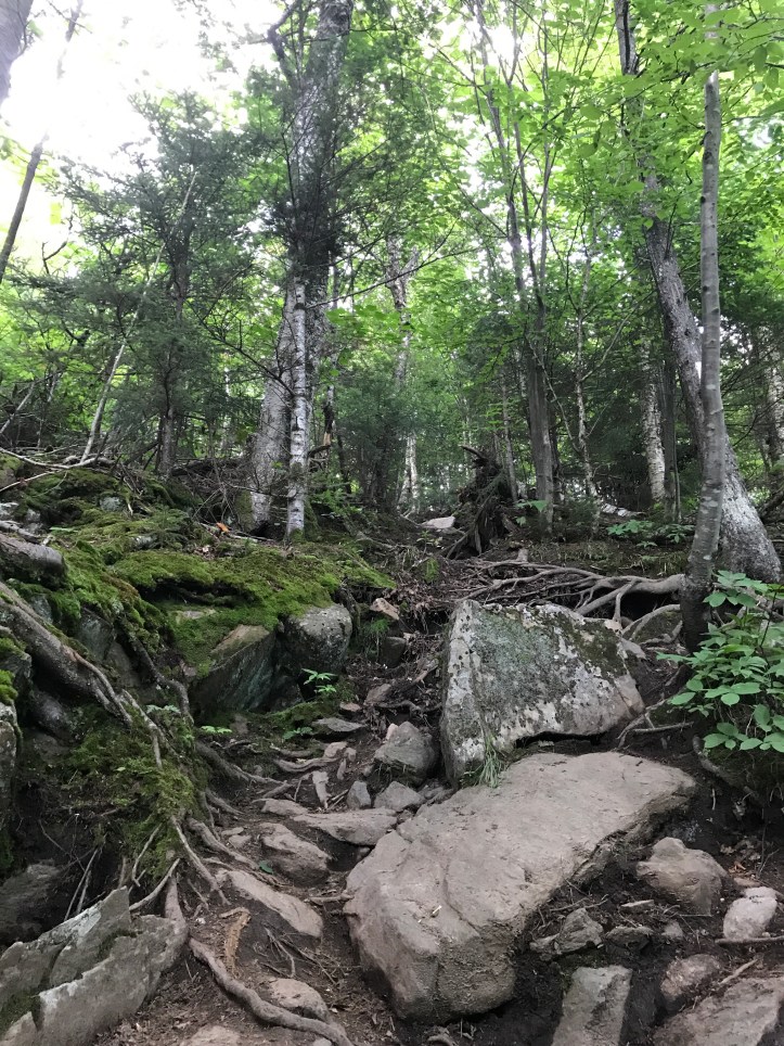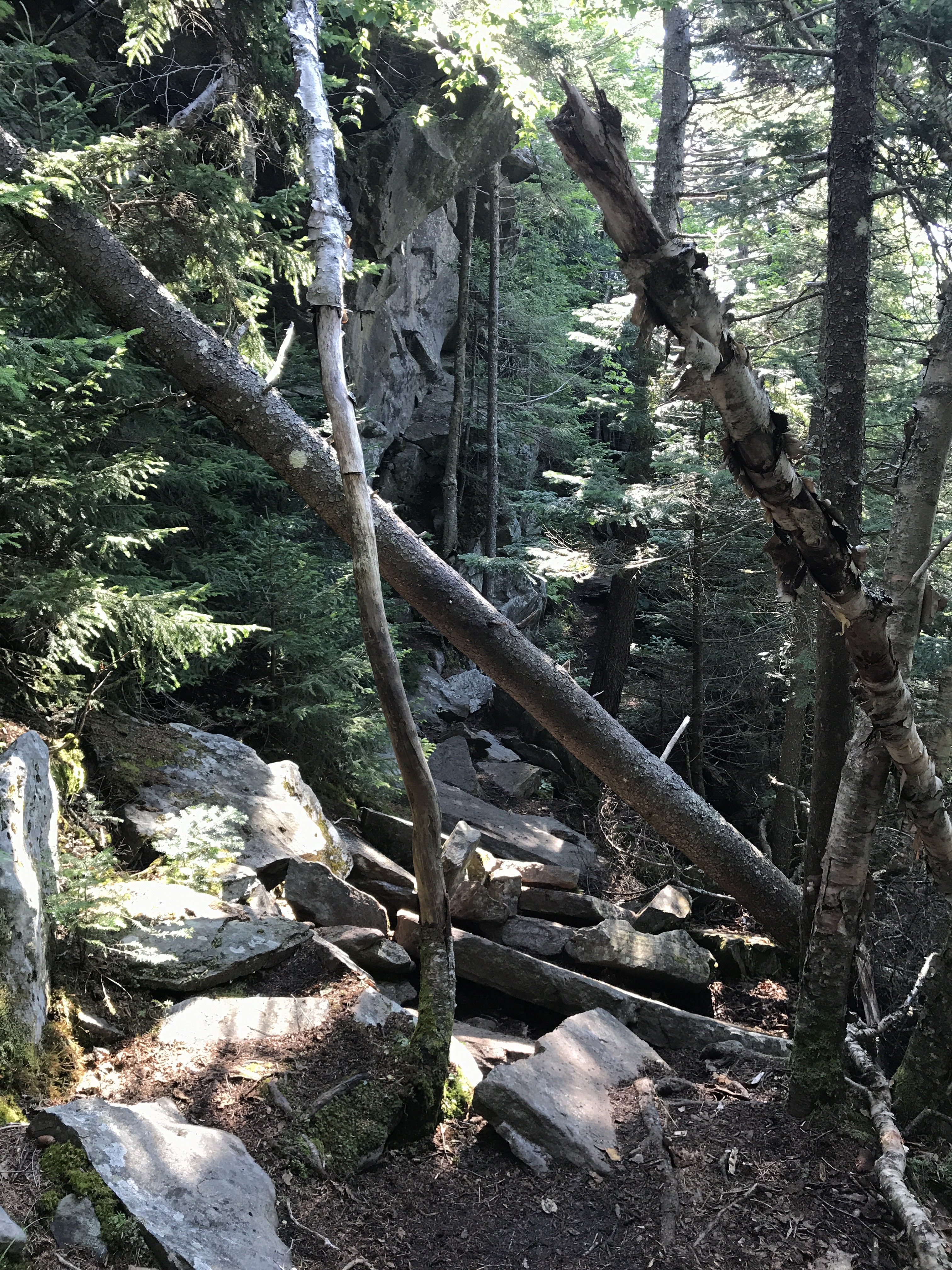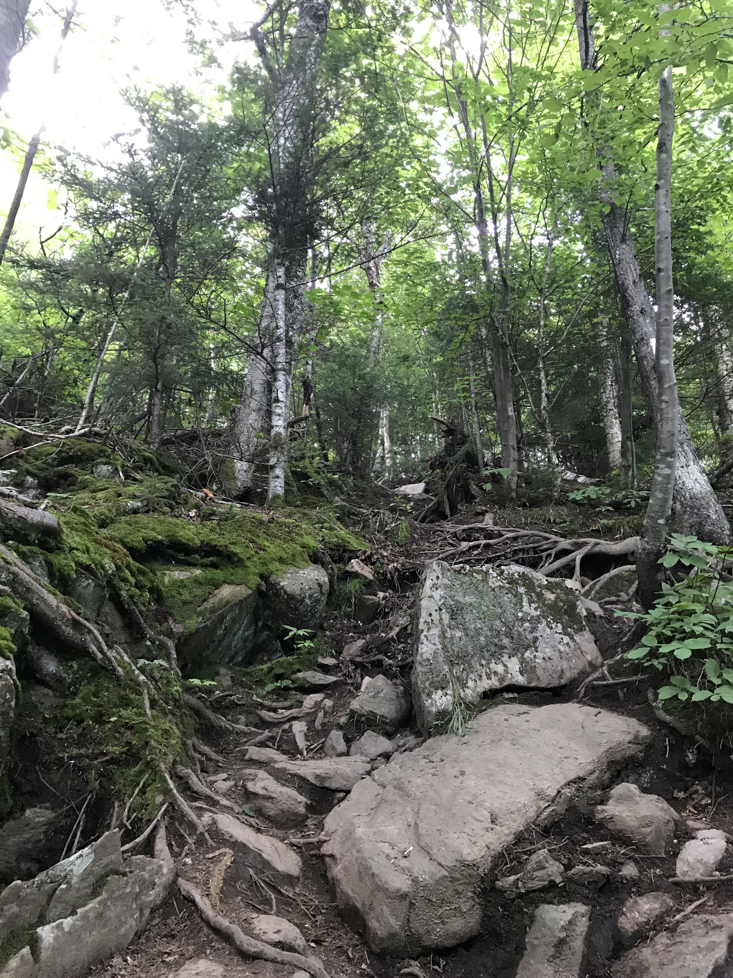 The rest of the morning passed without note. The trail wound through hardwoods past several ponds. Sodden coils of birch bark lay strewn on the forest floor like rumpled table runners. The footing vacillated between densely packed roots and short stretches of mud with little change in elevation save a few brief, rocky hills such as this: