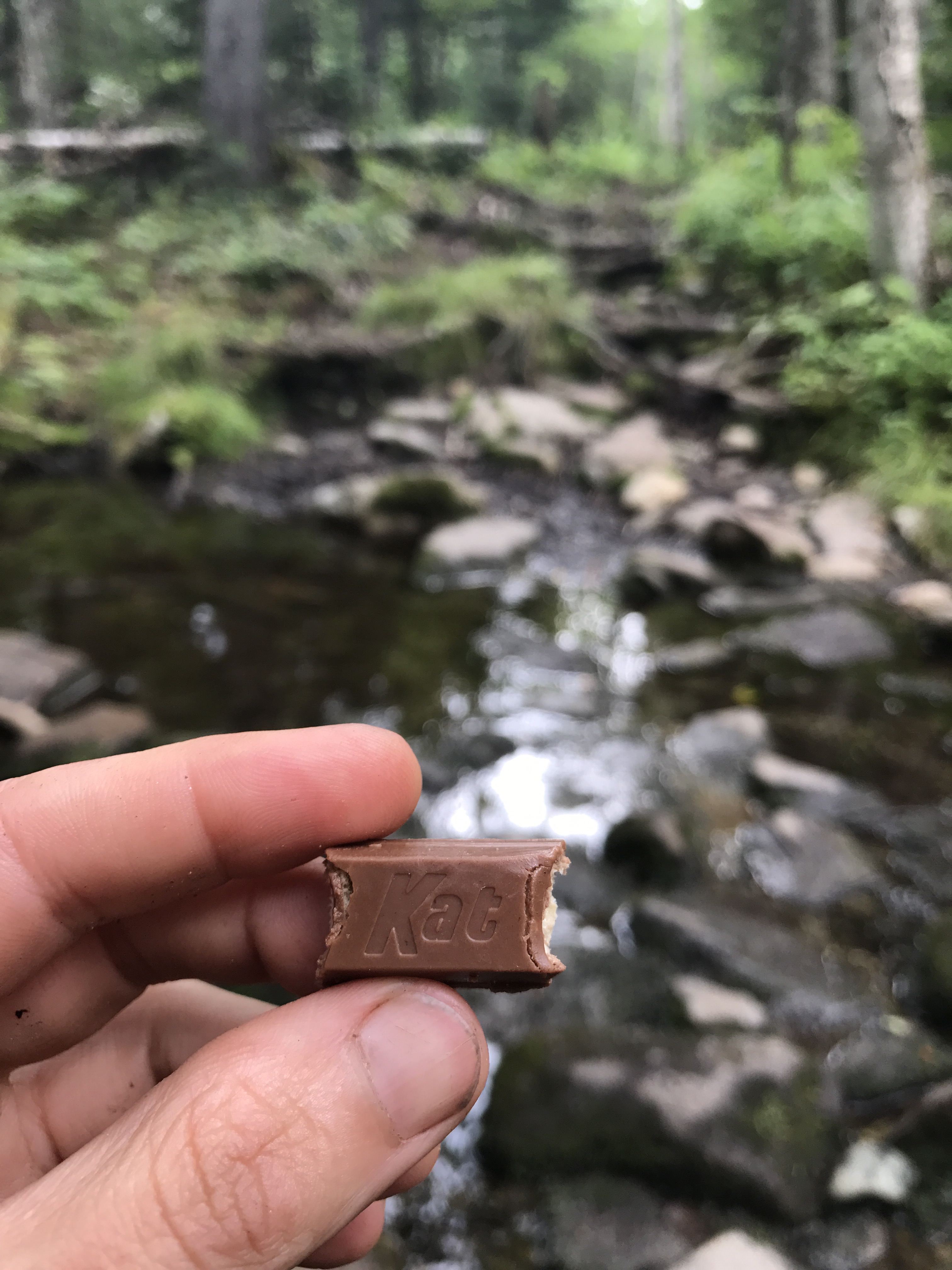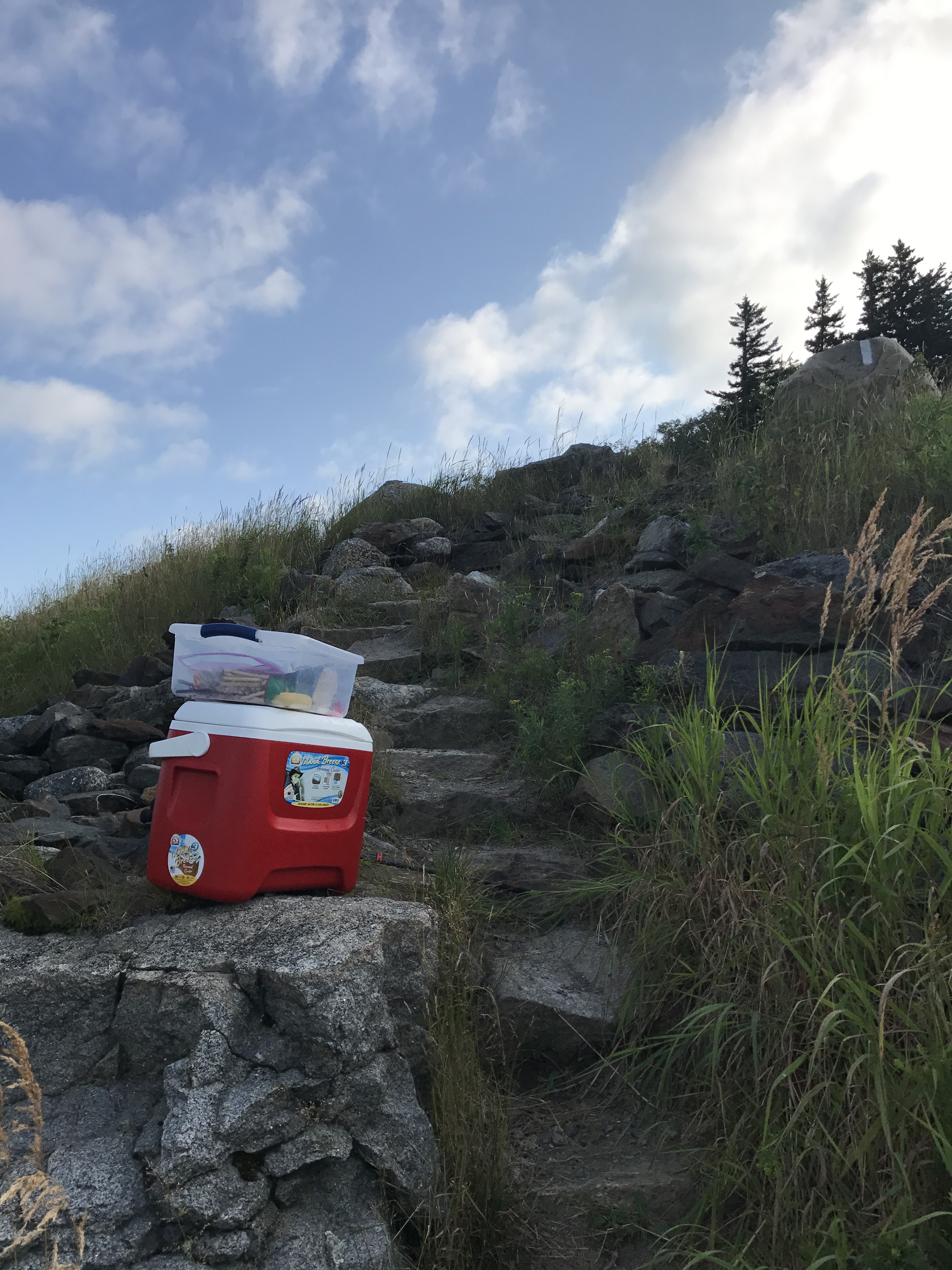After my pitstop, the trail climbed toward route 17. I couldn’t shake the sluggish feeling as I picked my way over roots and awkwardly spaced boulders. The woods eventually opened up to a grassy hillside and stone steps where I found this cooler and a Tupperware with pretzels and KitKats and A BANANA.