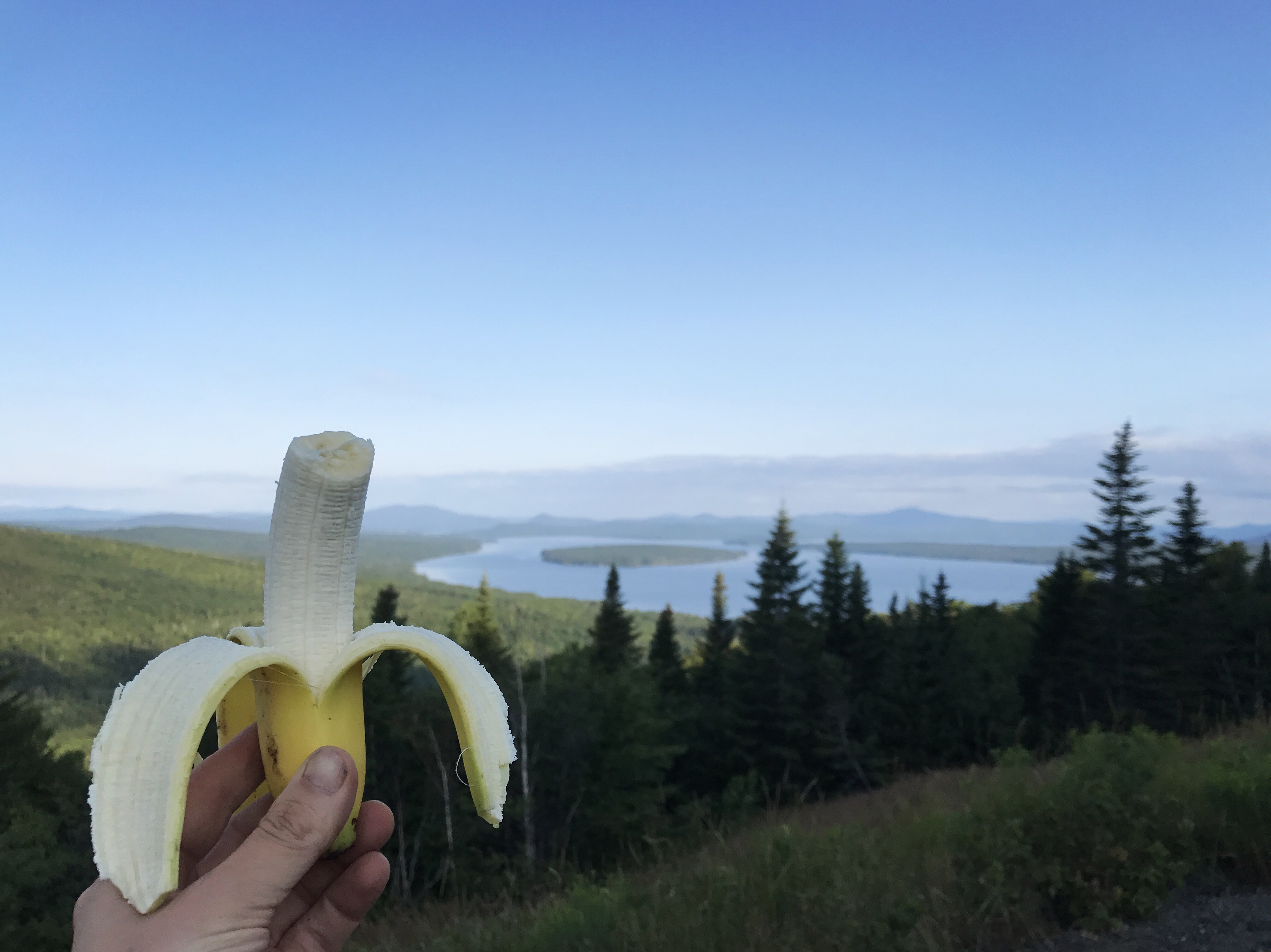 I’m low on lunch food and feeling worn down, so the surprise supplies were a huge pick me up. I grabbed two kitkats, a sizable handful of pretzel sticks and the banana. I signed the log with a gracious thank you and made my way up to the road where I sat on a bench to eat my banana and take in the view from today’s top picture.