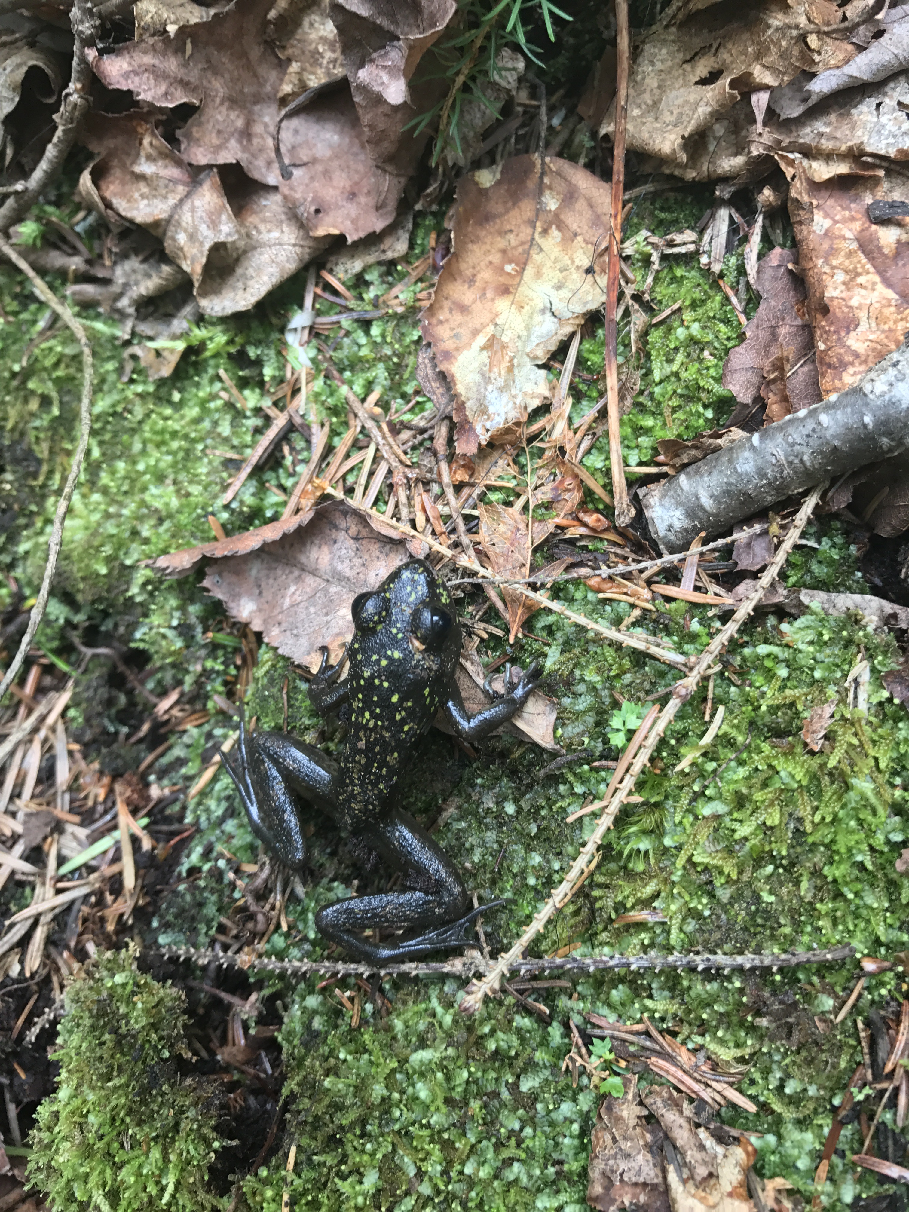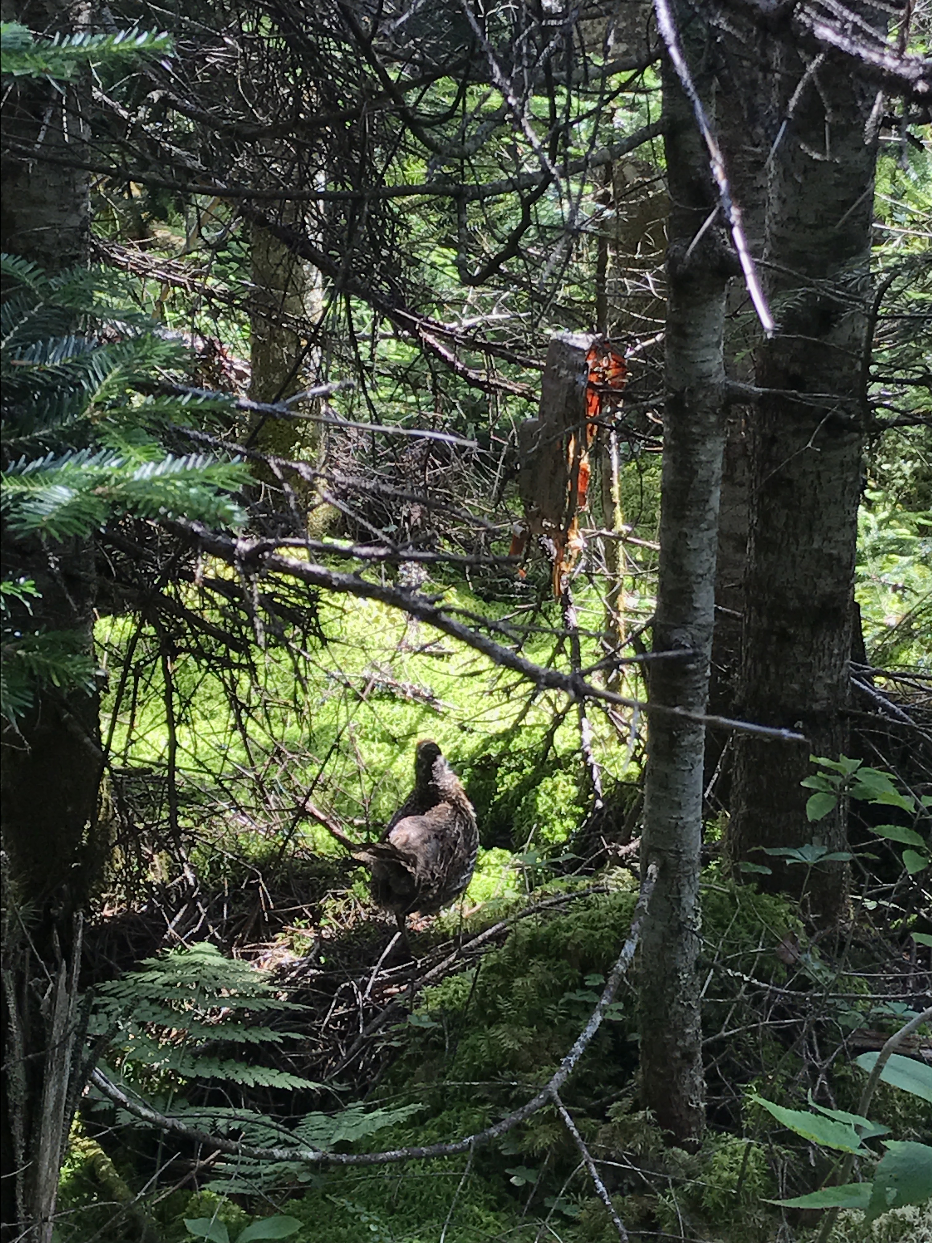There was a long, gradual climb away from Sabbath pond. My legs protested at first, telling me they were tired from yesterday, but they soon settled in and did what I asked of them. A breeze flowed through treetops, periodically dipping low enough for me to feel the air rustle my hair. I walked along listening to fiddle tunes and appreciating the mild weather. At one point, I looked up to find a young grouse on a bog board about 10 yards in front of me. It twittered quietly and crossed into the moss next to the path. Here’s a mediocre picture that I managed to get once the surprise of seeing the bird wore off: