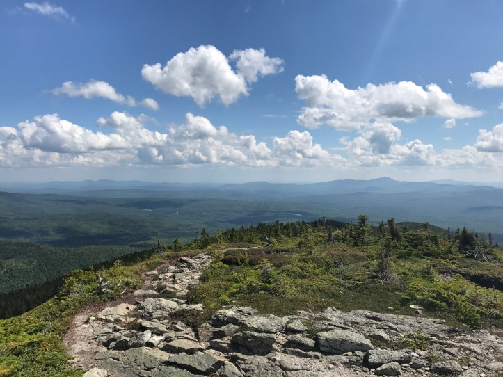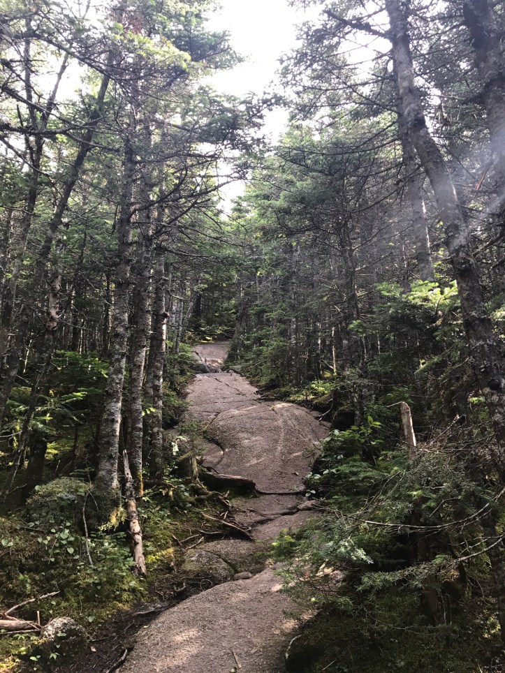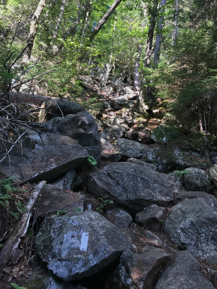 The descent became steep almost immediately. I carefully picked my way down the jumble of boulders. As I placed my right foot on the slanted surface of a rock, my foot lost its purchase and I went tumbling onto my right elbow/forearm and right butt cheek. I landed hard enough to make me shaky, and the pain in my butt was sharp enough to make me nauseated. Normally when I fall, I pause for a second and immediately resume hiking. This time, I took my pack off and leaned against the offending boulder to collect myself. My right arm felt a little strange, which made me paranoid that I’d broken something. I gave it a minute and moved it around to test for pain. Nothing hurt, so I concluded that I’d just knocked the crap out of myself. A red welt had already formed on my rear, so I’m sure that will turn into a substantial bruise. I also worried about my tailbone because of how hard I fell. There was a shot of referred pain from my glute to my tailbone as I resumed walking, but it was short lived. There’s a saying among NOBOs “no pain, no Maine.” I think that applies on a micro level to just the state of Maine. I’ve fallen at least once every day, and the one day I didn’t fall, I got stung by bee, which hasn’t happened to me in literally 25 years. I think Maine is trying to kill me.