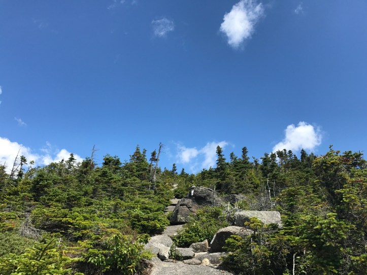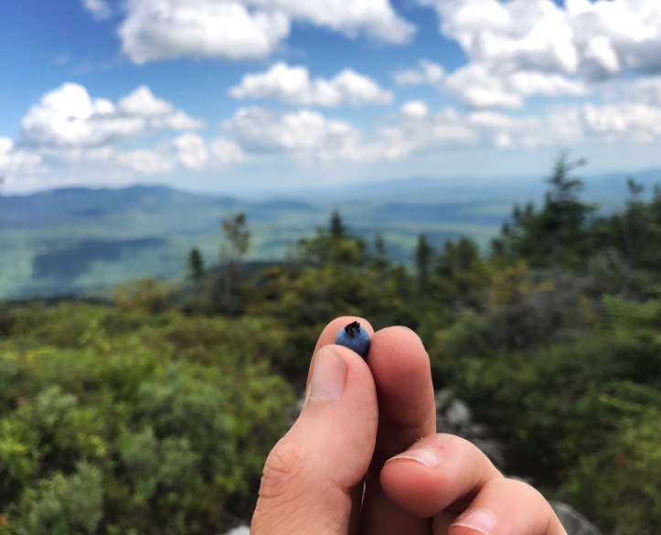 I walked past the sign and took another short break in the sun just low enough from the summit to be out of the wind. I happened to notice a squashed blueberry on the path, which made me realize I was surrounded by blueberry bushes. There weren’t many ripe ones here, versus bemis, which was littered with edible blueberries, but I managed to collect a handful.