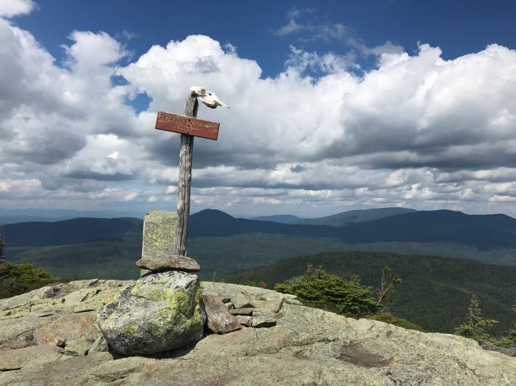 When I finally reached the summit, I stopped just long enough to eat a snack because it was too cold to sit exposed to the wind. There was a rocky windbreak similar to those on moosilauke, but a group of teenagers occupied it with no signs of imminent departure. A day hiker from the southern tip of Maine tried to talk to me, but it felt like I had to yell over the wind, which is not a conversation for which I have stamina. As I put on another layer in preparation to leave, Tater and Norseman approached the summit. I asked Norseman if I could take his picture because his beard looked so at home on top of a rugged mountain. He happily consented and then posed with his flag for good measure. Not sure what the story is, but I will let you know if I find out.