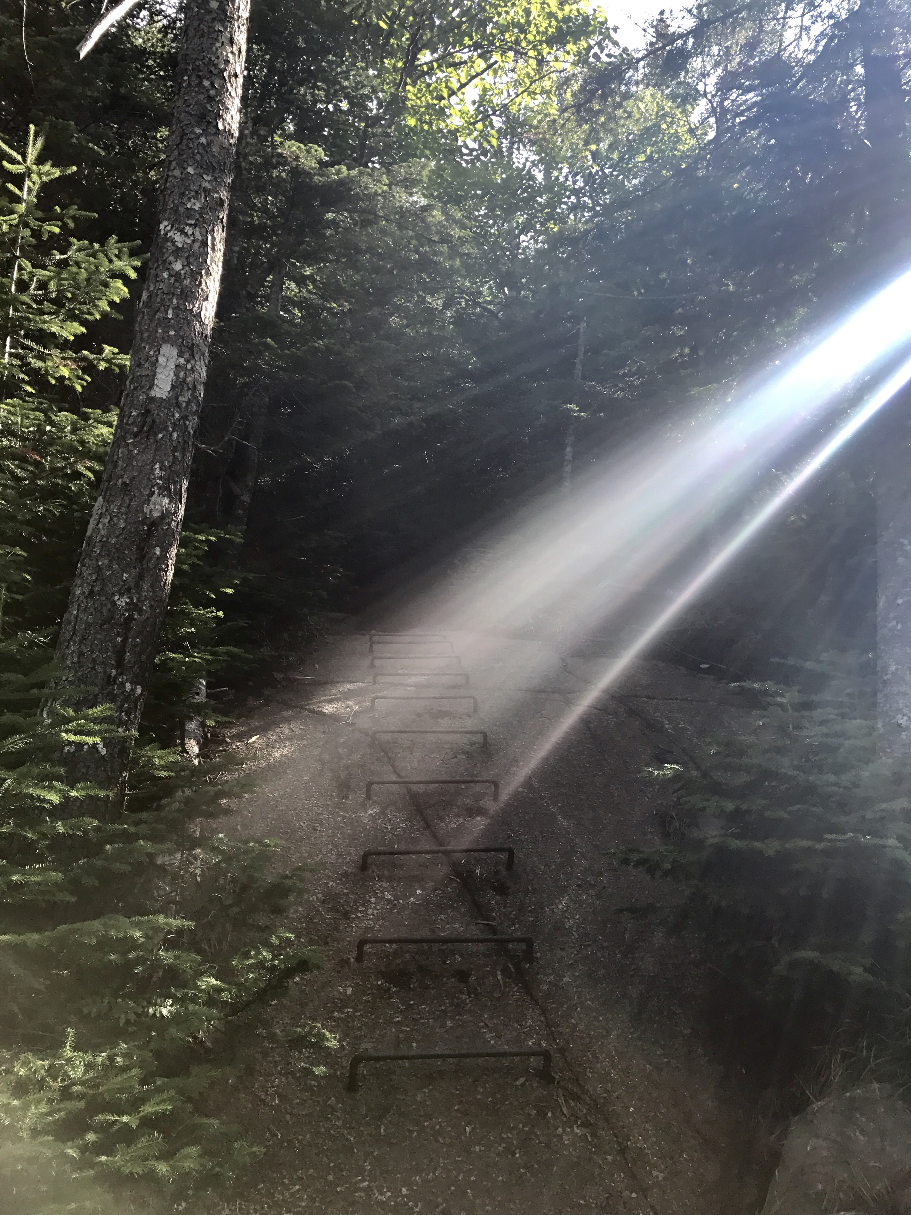 My watch alarm went off at 5am. It felt like I’d only been asleep for like two hours, but I wanted to catch the 630 shuttle, so I had to get up. I heard the trill of loons as I lay in the dark trying to find the will to get out of bed. I went downstairs and ate yogurt with banana and the cinnamon raisin bagel that I bought yesterday in town, which I toasted it and put butter on one half and peanut butter on the other half. I can never seem to eat a bagel just one way. An older gentleman named Super Mario skulked about while bangles and I ate breakfast at the table. Super Mario has a bushy gray handlebar mustache and wears thick red suspenders that are likely the source of his trailname, but I didn’t actually ask the question.