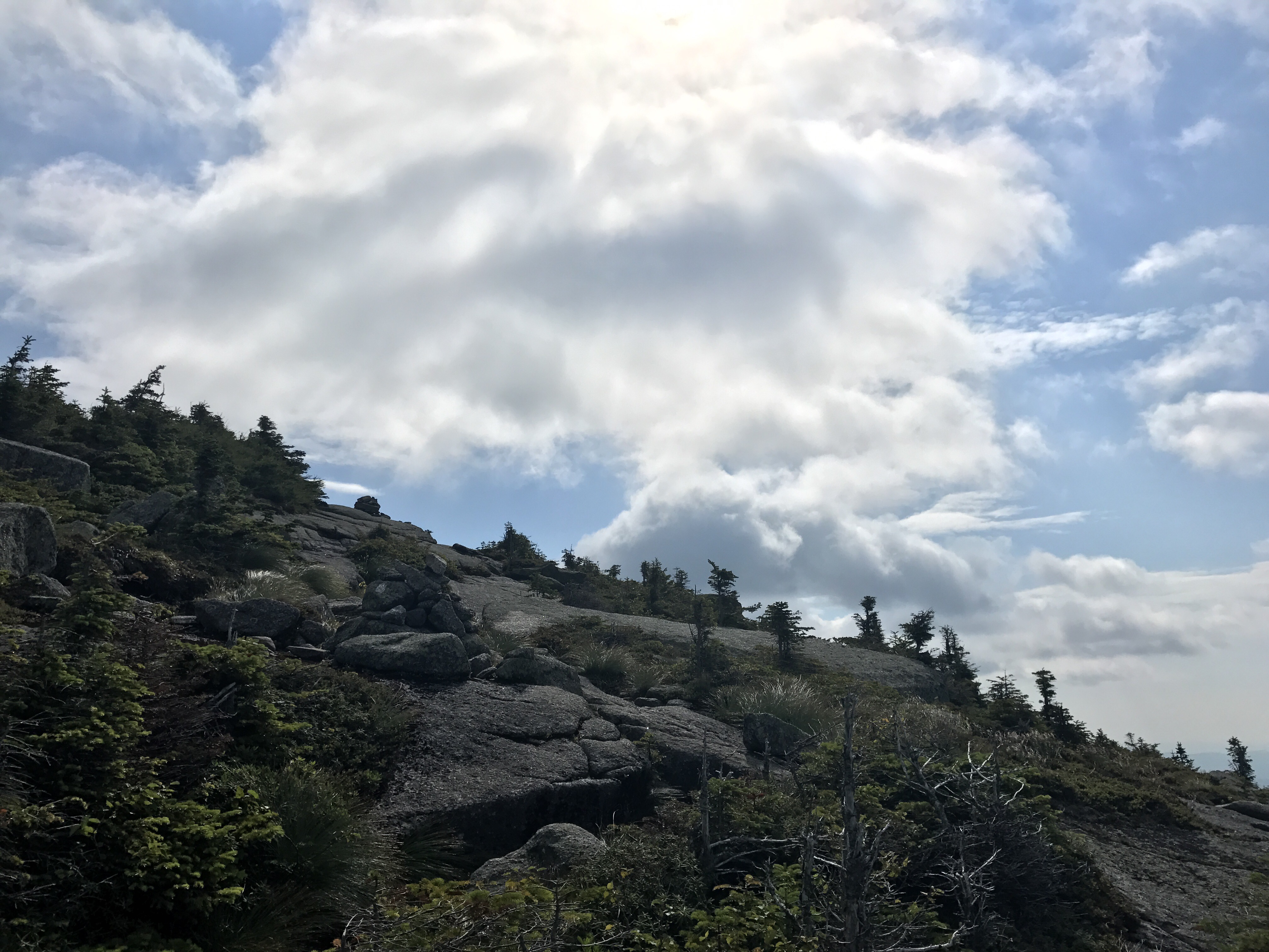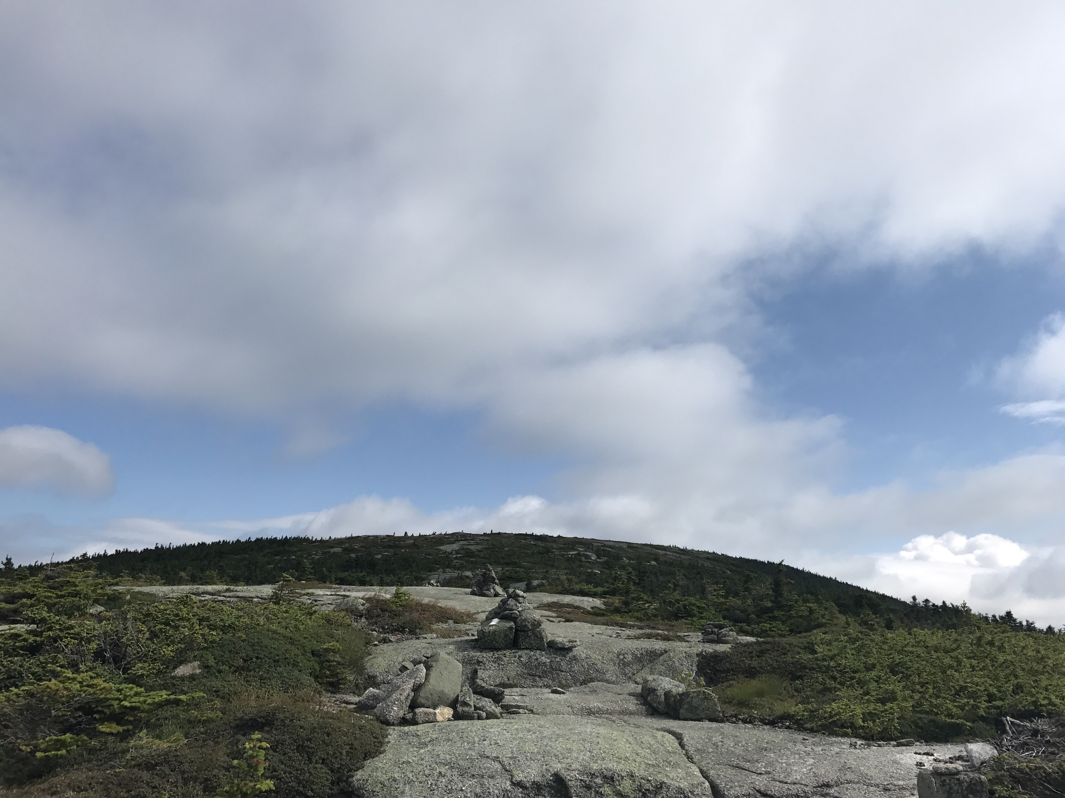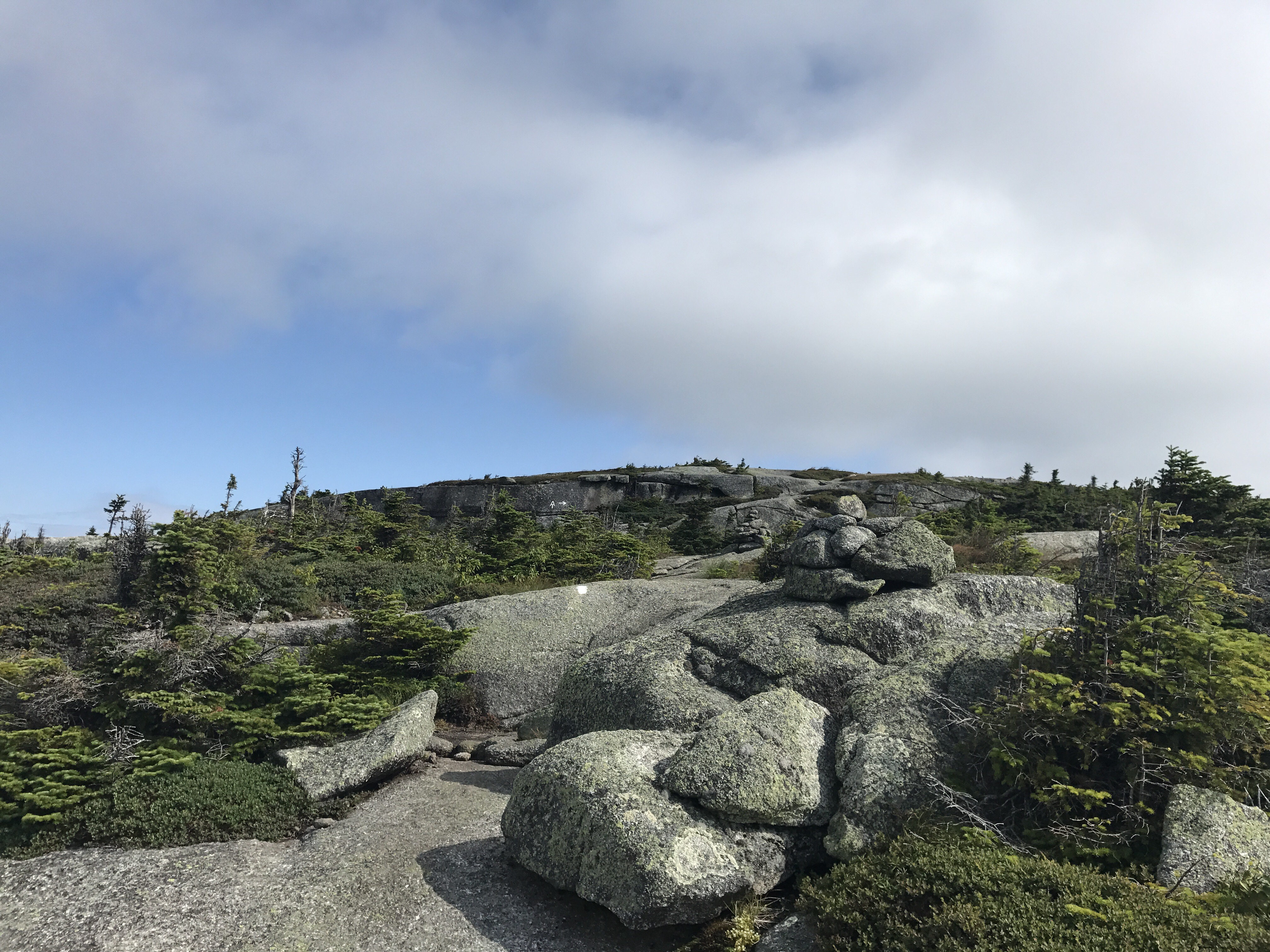 I walked past the sign and took another short break in the sun just low enough from the summit to be out of the wind. I happened to notice a squashed blueberry on the path, which made me realize I was surrounded by blueberry bushes. There weren’t many ripe ones here, versus bemis, which was littered with edible blueberries, but I managed to collect a handful.