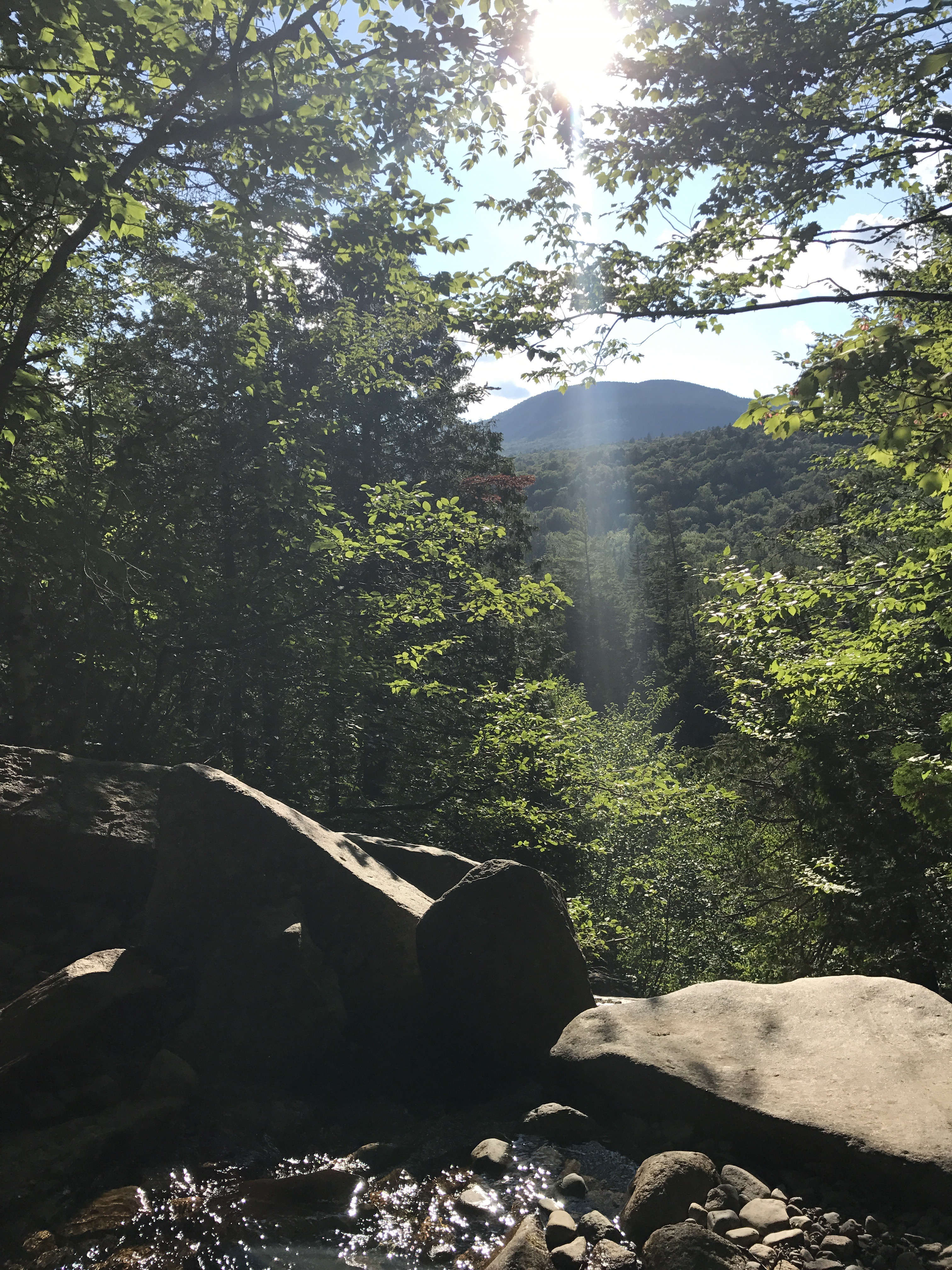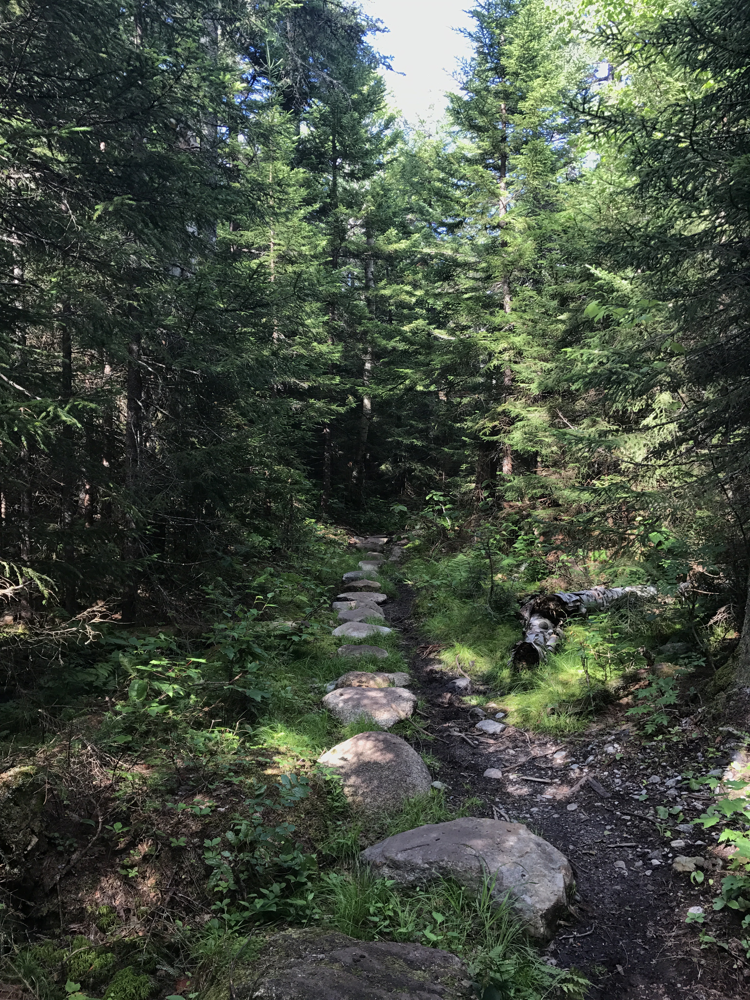 The descent became steep almost immediately. I carefully picked my way down the jumble of boulders. As I placed my right foot on the slanted surface of a rock, my foot lost its purchase and I went tumbling onto my right elbow/forearm and right butt cheek. I landed hard enough to make me shaky, and the pain in my butt was sharp enough to make me nauseated. Normally when I fall, I pause for a second and immediately resume hiking. This time, I took my pack off and leaned against the offending boulder to collect myself. My right arm felt a little strange, which made me paranoid that I’d broken something. I gave it a minute and moved it around to test for pain. Nothing hurt, so I concluded that I’d just knocked the crap out of myself. A red welt had already formed on my rear, so I’m sure that will turn into a substantial bruise. I also worried about my tailbone because of how hard I fell. There was a shot of referred pain from my glute to my tailbone as I resumed walking, but it was short lived. There’s a saying among NOBOs “no pain, no Maine.” I think that applies on a micro level to just the state of Maine. I’ve fallen at least once every day, and the one day I didn’t fall, I got stung by bee, which hasn’t happened to me in literally 25 years. I think Maine is trying to kill me.