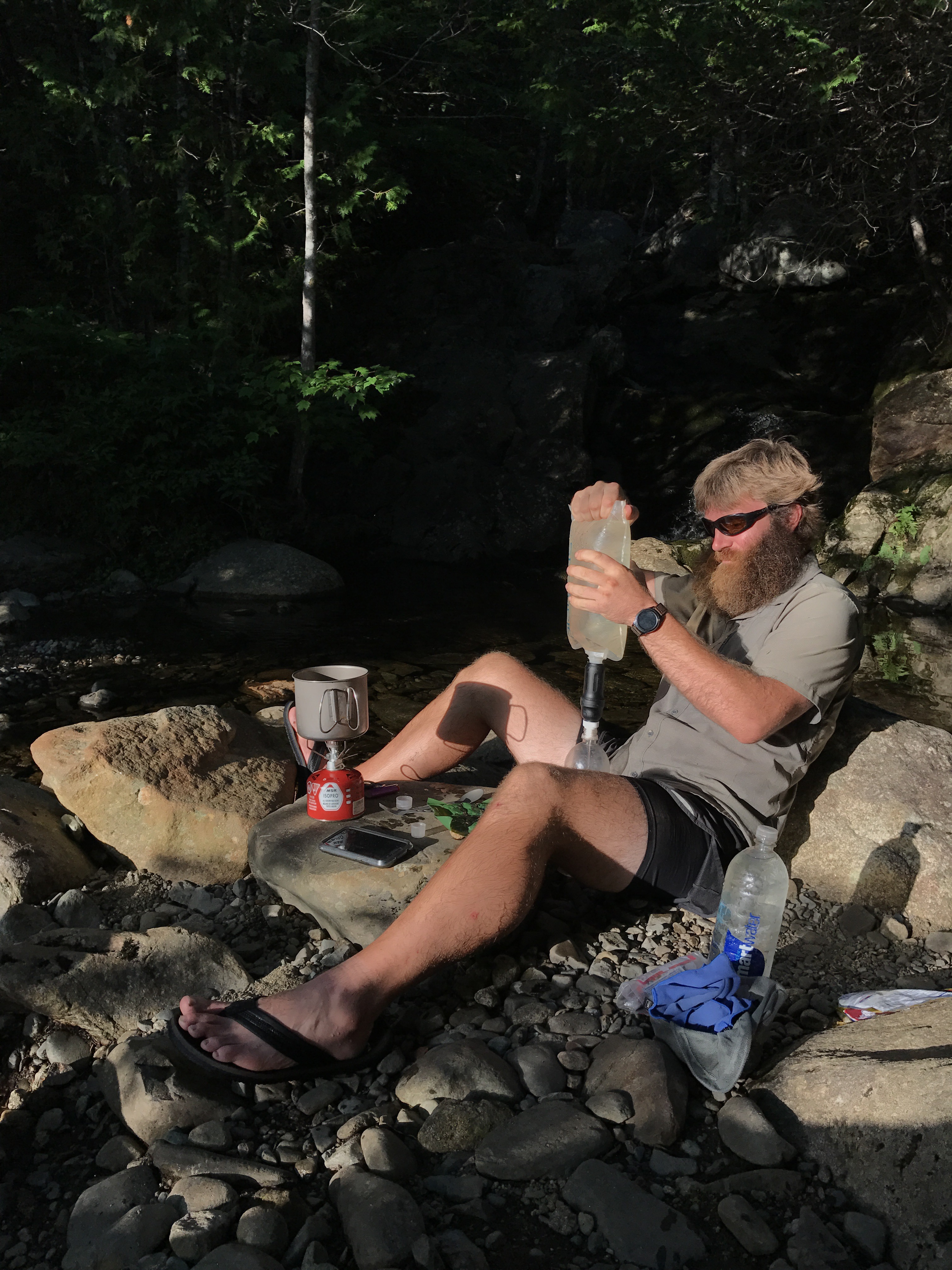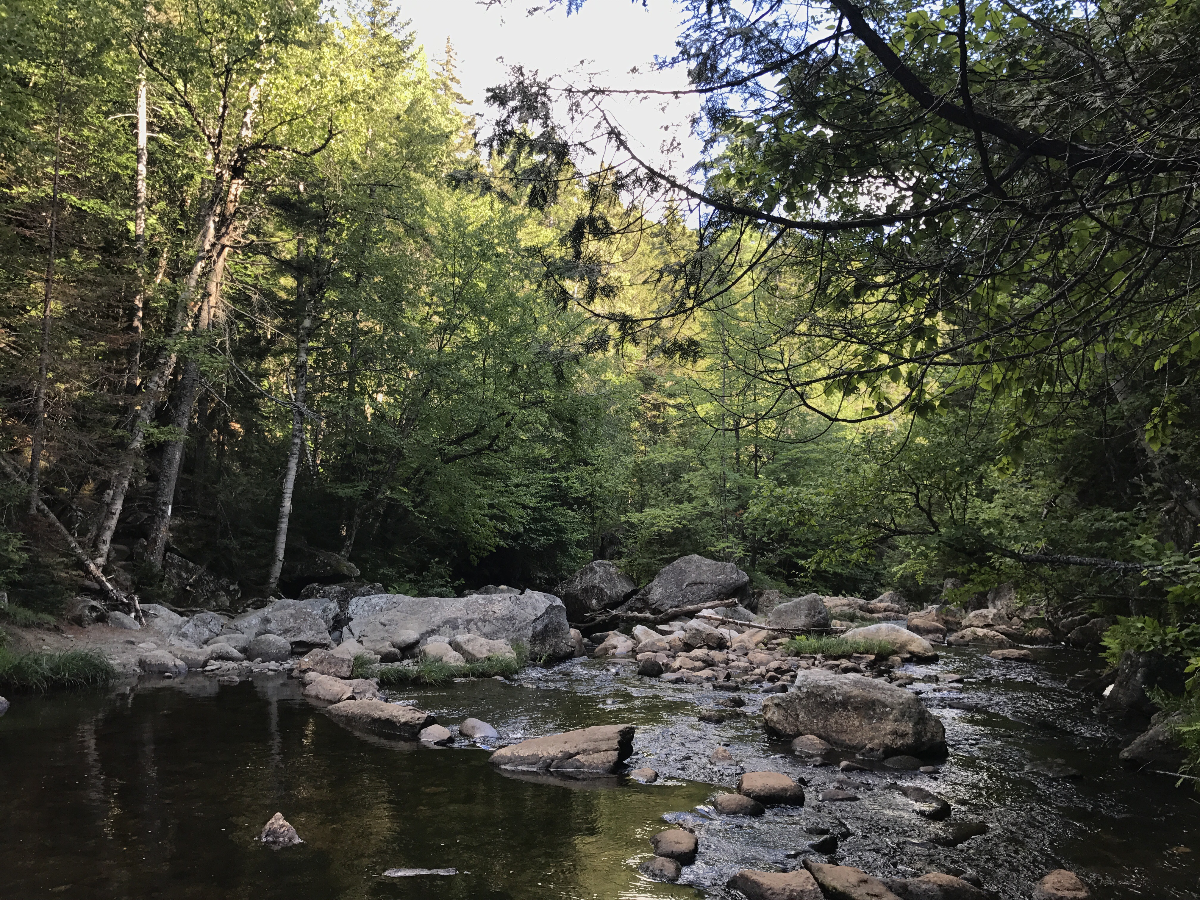 When I got to the edge of the water, I surveyed the potential paths I could take. My strategy seemed promising, but the fourth rock that I stepped on wobbled in such a way that both of my feet slipped right over the sides and into the shin deep water. My left shin grazed the rock on the way down, giving me yet another bruise for the day. I stood there in disbelief and then, rather than bother with rocks, I simply walked through the water to the other side of the stream. I stood on the bank with water pouring out of my shoes and said “thanks, Maine” in a sarcastic voice. Then I said, with forced amusement, “I just washed my shoes” trying to use moss’s perspective from his fording in VT.