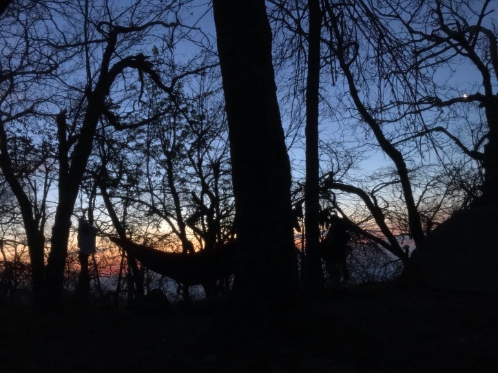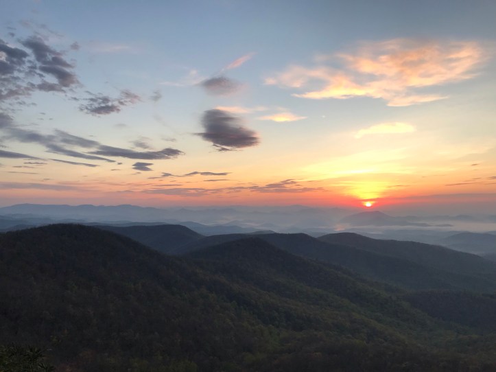 But my skepticism and tiredness got the better of me. There looked to be a layer of clouds that were going to dull the colors. I laid back down and considered going back to sleep. My plan for this morning’s “letter to Congress,” as Nobody called his morning bathroom break, was to hike the 0.3 miles to the shelter and use the privy because I didn’t feel like dealing with the privacy and effort of digging a cathole. My stomach, however, had other plans. I dug out my trowel and TP and wandered down the side trail into the rhododendrons. Thankfully there wasn’t a lot of ground cover and the poison ivy was pretty sparse. Rhododendrons, by the way, make for good support systems.