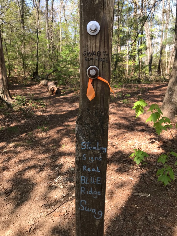 I stopped to check for water sources at “swag of the Blue Ridge,” which is just a midpoint between two mountains. Some idiot stole the sign; probably because it said “swag.” Water today is somewhat terrible and all off-trail except one that is 6 miles away.