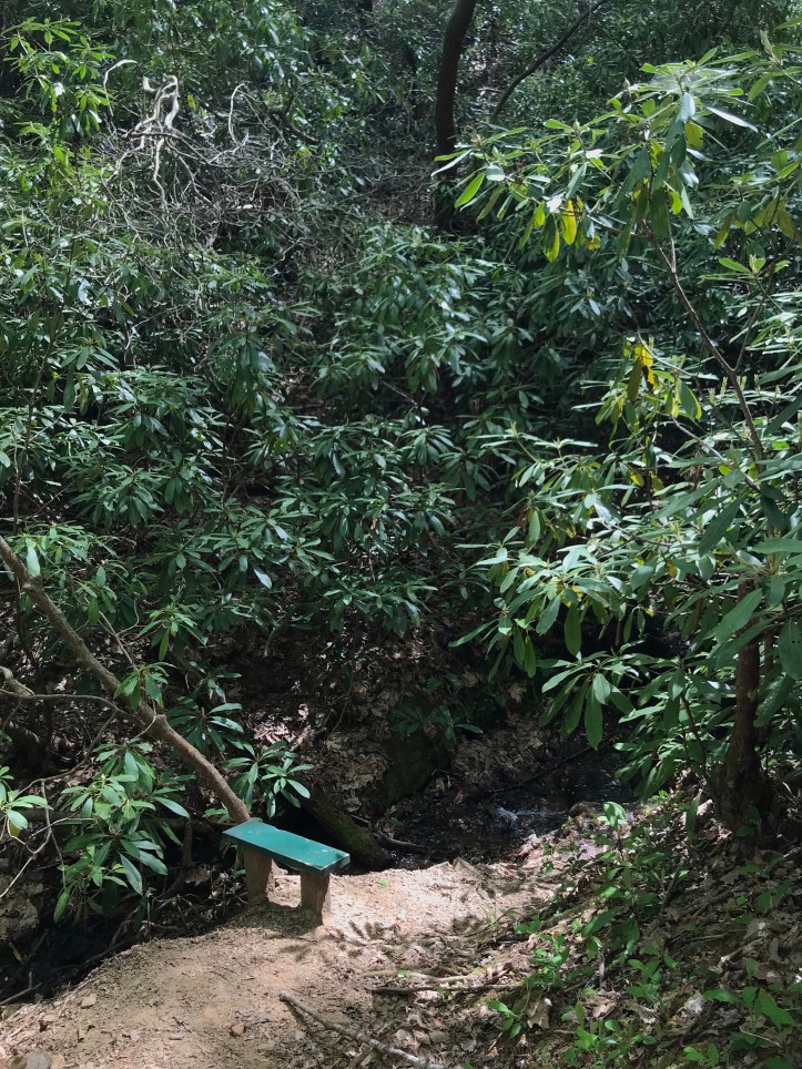 I finally passed the water source I had been considering, but at that point I just needed to be done. Rather than filter water, I dumped a scoop over my head and kept moving. The last part of the descent took me through a thick Rhododendron tunnel next to dicks creeks where I eventually passed this thinking spot.