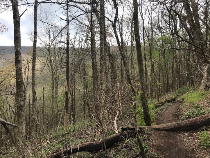 The Trail slowly lost a bit of elevation as it led me down towards the Carter gap shelter. A long ridge line loomed over to my left. the woods were full of blow downs and small evidence of fire.