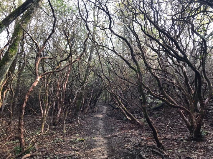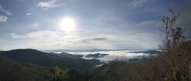 I passed through yet another burned rhododendron stand where bright new growth had started at the base of many of the trees. The trail had twisted us around in such a way that the foggy valley was now on my right. City gait came blazing through at mall-walking speed holding his poles as he went by. He joked about seeing me pass him on the uphill and I said in my head “not today.” About 30 seconds later i noticed a short path that led to an unobstructed view of the mountains below. Sunny stopped at the edge of the trail looking at me as if to say “should I bother?” She’s having SI joint pain today so the extra steps probably didn’t seem appealing. And I said “it might be worth it!” So she joined me in gawking at the scene before us (today’s top picture – a pano so the ratios might be weird on your screen). I could have stood there all day.