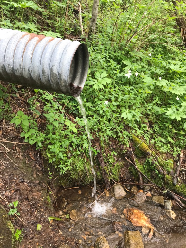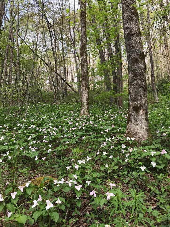 I also Forced myself to stop and get water even though I heard laughter a little ways up ahead and felt the urge to try to catch up to what I assumed was sunny and city gait. But socializing is not one of today’s goal. Hydrating IS. I filtered water from a culvert pipe that has started its own little ecosystem. Just past the water I looked up to find a hillside of trillium standing at attention: