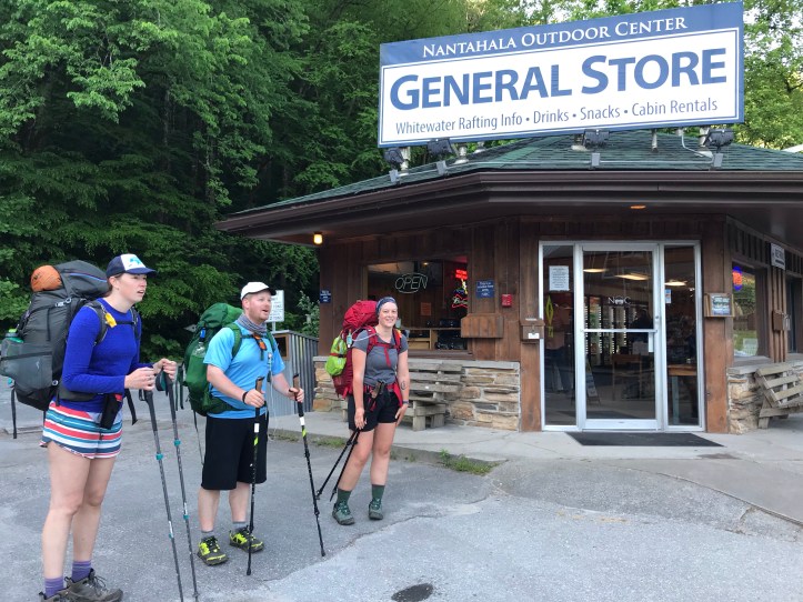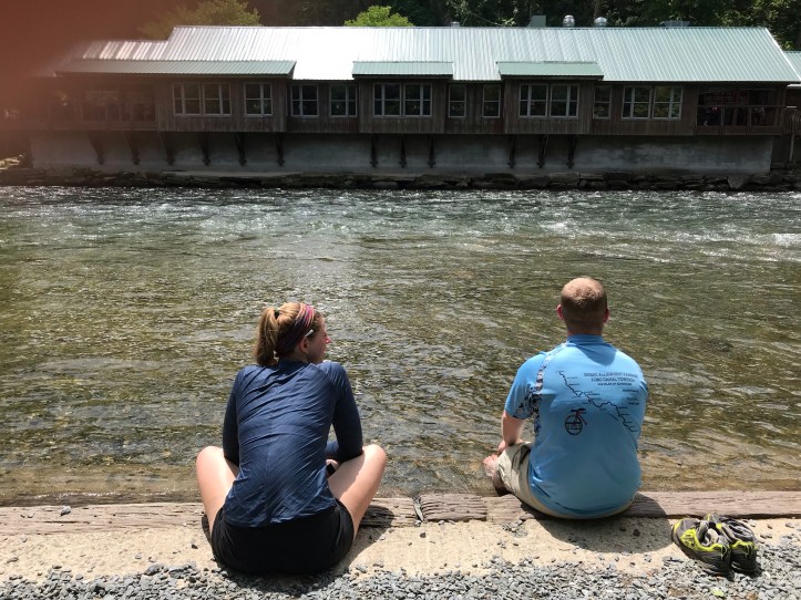 They’re all going up to Sassafras Gap shelter tonight. I had intended to go past that to the tent site because today’s weather will be better than tomorrow, but the longer I was at the NOC, the more tempting it was to stick with company. Sunny may be ending her hike on Friday because her mom her happens to be around here on a road trip vacation and she might just ride home to Canada. If I go short today, I will still make my destination on Friday, at which I’ve already decided to zero. so there’s less pressure to try to make Friday a super short day in order to get more time off my feet. I waffled back-and-forth about whether to stay or whether to just get moving. Staying felt “irresponsible” and leaving felt lonely. I finally decided that after yesterday, maybe today would be a good day to have more company while it’s available. I was still agonizing when West Texas asked me if I wanted to go eat lunch at the restaurant. I said no, but then about 45 seconds later, I said all right let’s go eat. The rivers end restaurant right next to the outfitter had an amusing combination of people over 70 in their white capri pants and dirty hikers eating burgers and fries. I opted for fish tacos and a side salad. The tacos were pretty disappointing, but it was nice to get more green matter besides the naked green juice I had earlier from the little store. I also had a healthy portion of West Texas’s sweet potato fries. Sunny opted out of lunch and sat with her feet in the water on the phone for a while. Around 1pm, I decided it might be time to get moving. It was hard to resist the call of the left hand milk stout during lunch and the longer I sat there, the more tempting it would be.