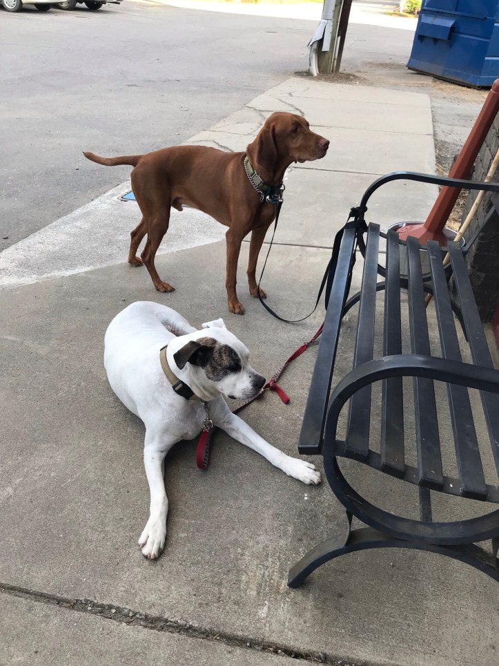 Creature feature: dogs! Many passing along the sidewalk and then the 2 in the picture above who mostly cared about their owners inside but they gave me a small greeting. A couple of cardinals and the usual cast of snack-hunting juncos