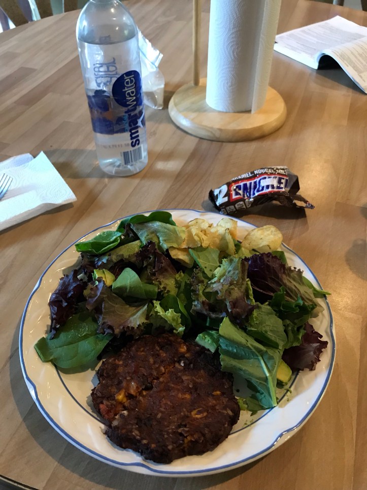 Around 6, I made myself a giant plate of greens with half an avocado and a few chips. I brought that down to the main building with Rosie’s salad and a bit of snickers for dessert. Rosie was finally back from her 13 mile day and she was overjoyed to see her salad. I offered her the other half of my avocado which she gladly accepted. I heated up a veggie burger from the freezer stash and ate that with my salad. It ALMOST felt like a real dinner. The only thing missing were raisins and olive oil for the salad.