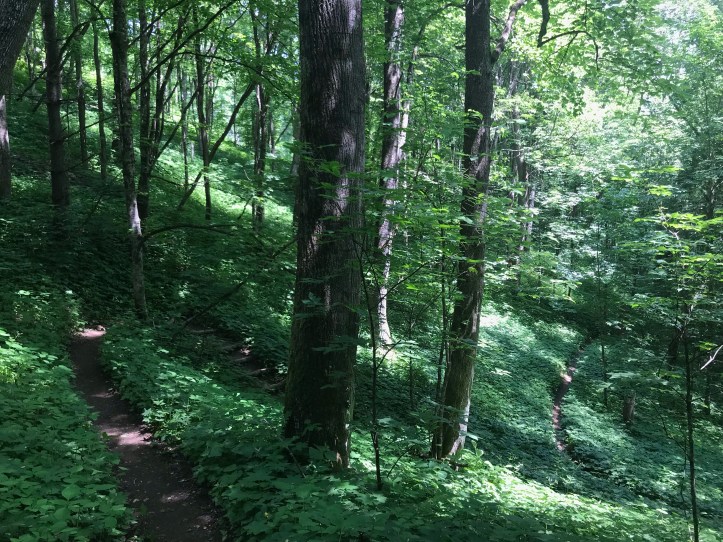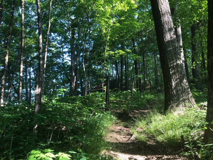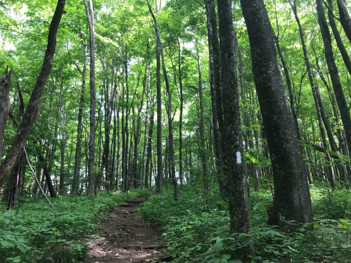 I ran across two northbound weekend hikers with a couple of dogs. I saw them from a distance and they stopped short to put one of the dogs on leash. I called out that they didn’t need to do so for my benefit but they did it anyway. when they got closer I realized why. The dog leaned against the leash, front paws barely grazing the ground with pure unadulterated yipping excitement to get closer to me. I imagine if they had left him offleash he would’ve jumped all over me. The trail then led me downward, twisting through thick groundcover.