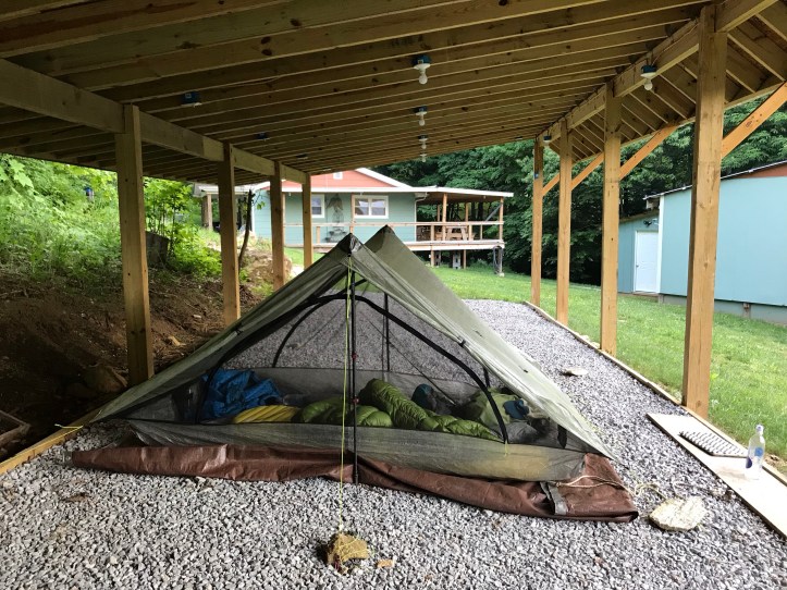 I walked over to the rental house and made myself a pb wrap which I ate with chip and a soda, experiencing non-recycler’s guilt with every sip. There’s no recycling service around here so they sadly don’t recycle the zillions of soda cans that hikers go through. After lunch, I went through the tedious but ultimately successful process of setting up my tent on the gravel. Then I set up my bedding while low-key freaking out about whether the double layer of tarp would be enough to protect my tent because I could see the pointy impressions of the gravel wherever I put weight down. Both my mother and Oakland assured me that it was probably fine.