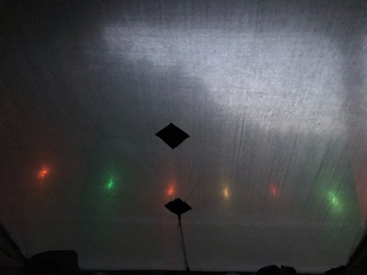 After dinner, I begrudgingly took a shower at Oakland’s urging. Then we had a FaceTime call before she headed off to give a fancy science dinner to a group of parents from her school. I’m finishing this to the sound of the creek, someone clanging silverware down at a cabin barbecue, and an airplane passing overhead. Hopefully Sara was right about the lack of bears because I have my toiletry bag and food bowl in my tent. Chances are high that I will actually be too paranoid to leave them here and will stow them in the house with my food bag. My left eye continues to tear up. Fingers crossed for a decent night of sleep in my new abode, through which I can see this cheerful string of lights that hopefully don’t keep me awake.