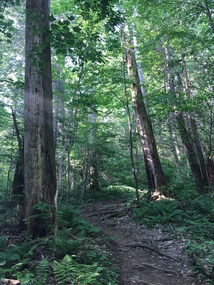 I took an early Snack break with Oakland. When I got moving again, I Decided to try taking the brace off. I Went about 20 yards and immediately decided I should put it back on. While i was already Stopped, I decided to take a quick bathroom break and Managed to pee about two minutes before several NOBO Hikers came along. Close call. On my way through the woods, i felt the sting of a fly biting my calf. I Killed it with a slap and regretted my decision to not bring bug spray. I Heard the quiet searching squeak of a bird I still don’t know the name of but hear often. I decided to listen to my sports meditation to help with my anxiety. The woods were cool and lush as I made my way up to little bald.