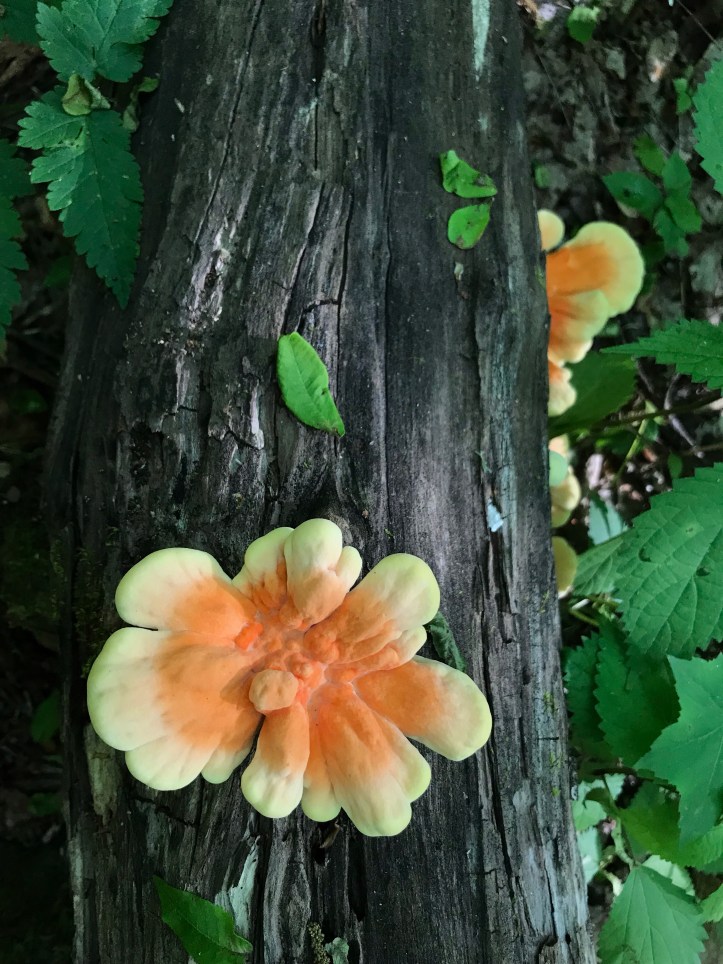 At some point, I passed a Neon mushroom that looked as if it should have a cartoon expletive like splat! Or kaboom! written on it. The humidity had sweat rolling down my temples. I Nearly missed a turn because I was about to Billy goat through a somewhat overgrown grown uphill that looked like it could have been the trail. As it narrowed I stopped and turned around to assess the rocks behind me and I decided that I had gone the wrong way. A few steps backwards confirmed that the trail actually curved very easily up and over flat rocks as opposed to following the snarled edge that I had been towards.