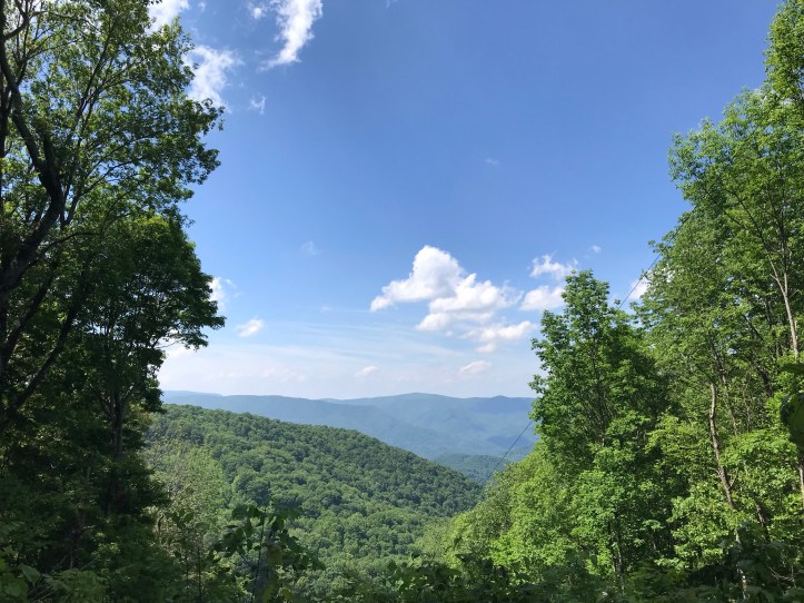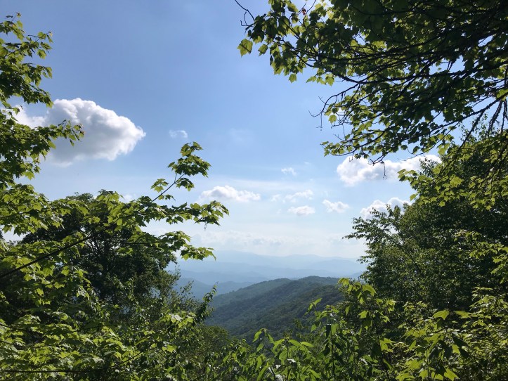 I had hoped to see a new bird or two in the open field but that sadly didn’t happen. I heard a cat bird right as I went back into the shady woods. Then came a somewhat pesky downhill with roots and loose rocks. I could hear the highway noise because I-26 is just compass west of here and the trail parallels it down to sams gap. The highway noise faded a bit and the trail evened out to a friendlier grade with better footing. I contemplated how I should navigate the next couple of days. Should I take a zero on Tuesday at uncle Johnny’s? Should I take tomorrow off to be super conservative? I also daydreamed about what to eat for dinner. I’m not sure whether I should try to eat through the dinners from my food bag or if I can continue with my veggie burger habit. I Walked along the still and shady side of hill for awhile until I eventually Rounded a corner to sunshine and a strong breeze.