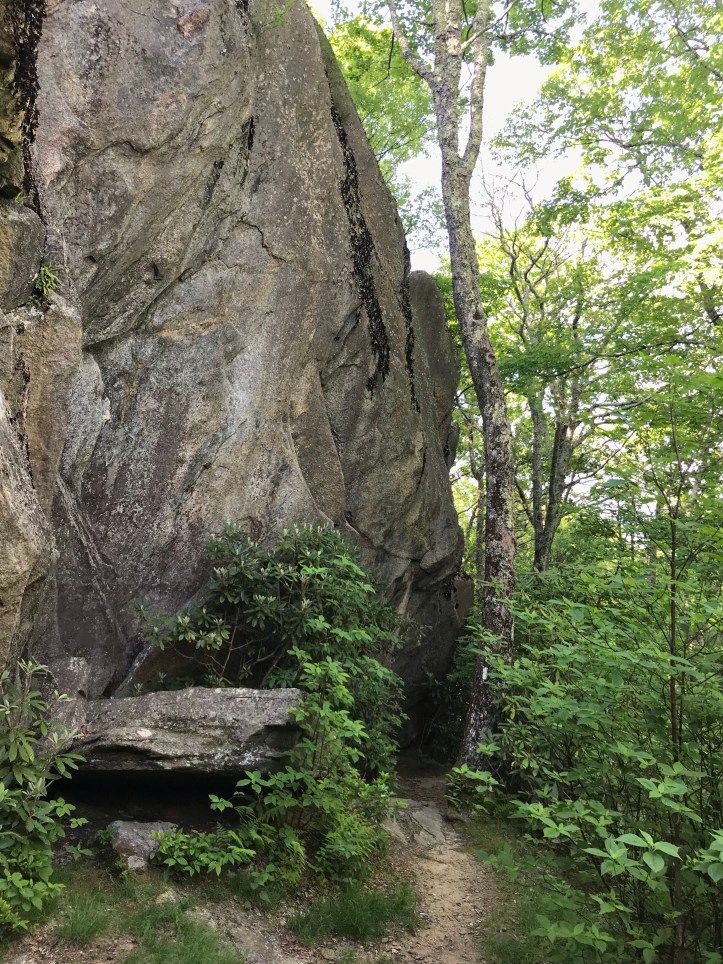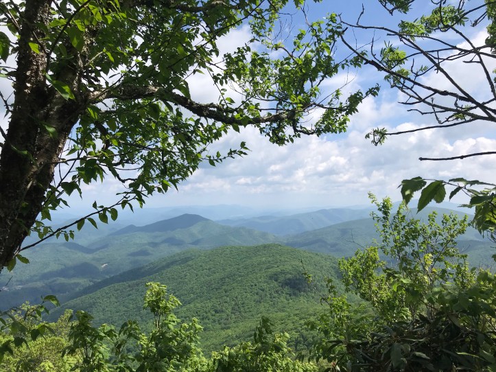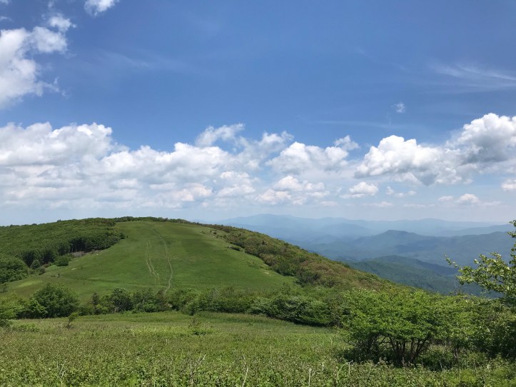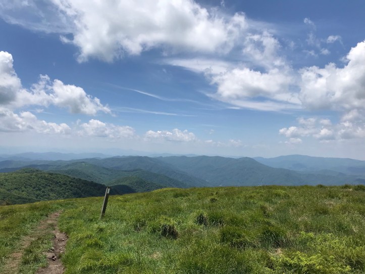 The Trail opened up to a sweet smelling field. I Passed a gaggle of people sitting at tables and chairs in a small stand of trees. My first thought was trail magic but then I noticed all of their binoculars. I asked If they were a birding group. One of them enthusiastically said yes! And asked if I had any questions. I asked them about my mystery friendly squeaking bird but they couldn’t figure it out from my description. They each played their guesses from their bird apps. I listened to one of them that hadn’t been named for me and I said no, it’s not a junco, which impressed the talkative one of the bunch. He asked me my name and I gave him my trail name, which he got a kick out. I eventually said I had to move on and they were sad to have not solved the mystery. I asked the name of their group and they directed me to “big bald banding.” I haven’t looked it up yet, but I guess they’re identifying and tracking birds? A few hundred yards after the birders, the trail opened up to a wide field with views of the mountains on either side of me and big bald looming up ahead. I Found a good rock to sit on with a nice view for lunch.