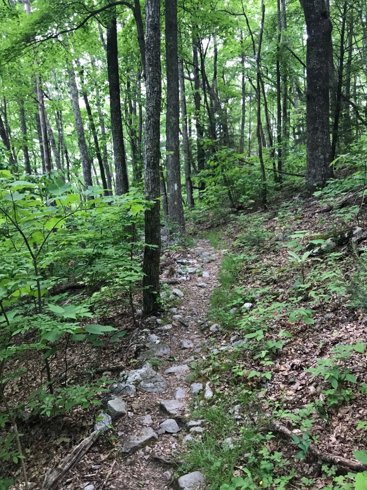The skies darkened as the incline continued, and I made my way carefully over brief sections of rocks and roots. It’s felt like it could pour at any moment with the dimming light seeming more like twilight than 930 in the morning. I of course bring a raincoat because rain is not in the forecast. Thankfully the temperatures are warm enough that if it pours all day I should still be fine. The trail narrowed and the footing got a little trickier with small rocks covering a Fair amount of it.