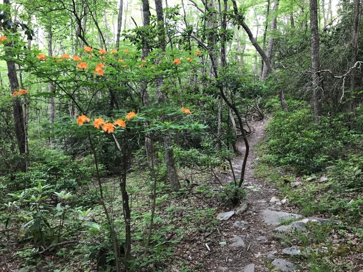 I felt a few twinges in the front of my ankle that frightened me, but they didn’t persist. I had been trying to find a decent place to have a snack but after the pain, I stopped virtually on the trail to eat and I took my shoe/brace off to breathe. I let Oakland know via gps that I had no signal and likely would have pretty spotty service all day based on the lack of elevation change. I heard the yip of a pileated woodpecker nearby as I ate almonds and dried blueberries (thanks family!) and watched a spider drop down from the lowest limb of a rhododendron onto a plant below. I gave my ankle a bit of a massage trying to think of what my friend Abby would do in this instance. She’s the neuromuscular bodywork person who helped me so much over the last 7 months.