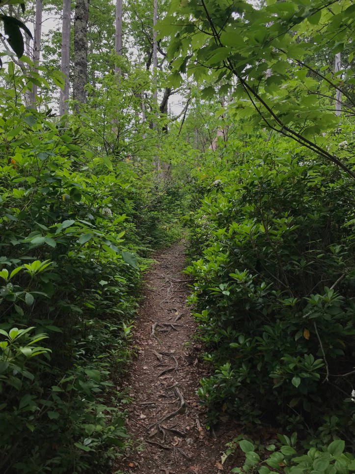 I went in and out of Mountain Laurel and rhododendron tunnels. The forest occasionally opened up and the sun attempted to come out. I Went through a greener section that had spit bugs on much of the ground cover.