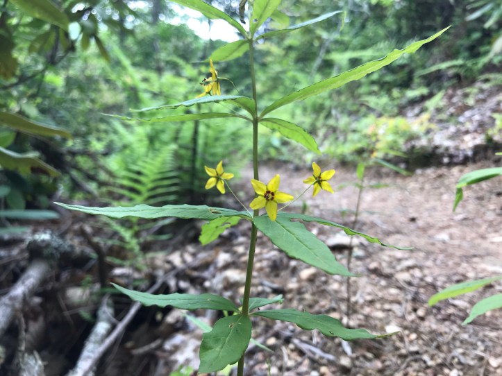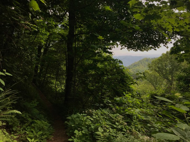 I heard a bird call I didn’t recognize and stopped to search the nearby trees. I peeked through a break in the leaves to find a male cardinal calling from the top of a dead tree. Not long after that, I came to a Picture window view of the mountains with swallowtail butterflies milling about. Then came more Switchbacks and a nice breeze.