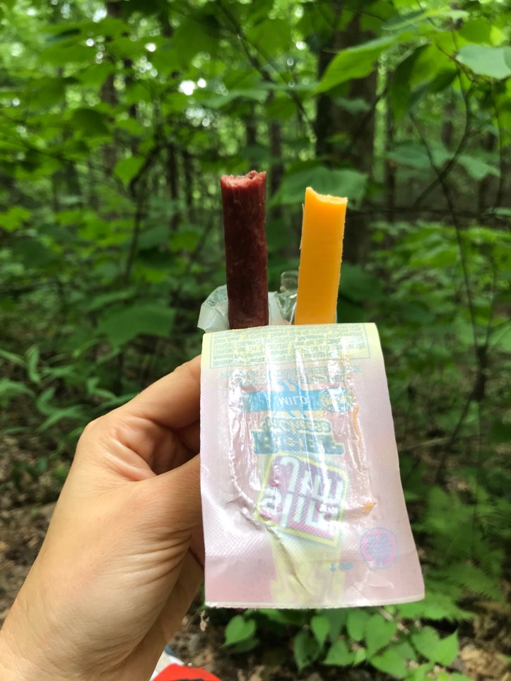 As I rounded a narrow bend in the flat but rocky trail, Texts popped through a wormhole. I sat on a mossy rock and told the theoretical snakes to go away while I had a short phone call with Oakland. I Decided to try my luck at moving to a more comfortable rock a few feet down the trail and had an early lunch with Oakland. I chose some hiker classics that I don’t normally carry but had purchased at nature’s inn as a treat: