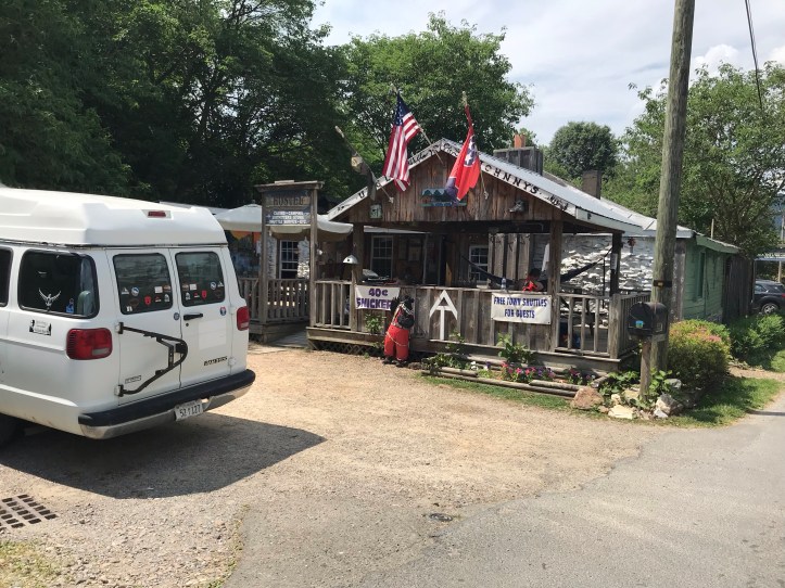 I went to bed a little later than I should have because of the pull to get another blog posted, but I slept much better than I did in my tent under the party lights. I got out of bed around 6:45 and ate my breakfast on the back deck while I wrote out some very early Father’s Day cards that I hoped to have sent out with Sara and Taft’s mail. Then I gathered my belongings, put body glide on my feet and squeezed in one more round of ice on my ankle. It’s stiff but not very painful if I keep the movements on the x/y axes. Circular motions are a different story right now but I’m sure those will be fine in time. I made sure to pack away the ziplock Sara gave me for icing my ankle in the hopes that uncle johnny’s will have some sort of ice situation. If all else fails I can dunk my leg in the Nolichucky River, which is right out their front door.